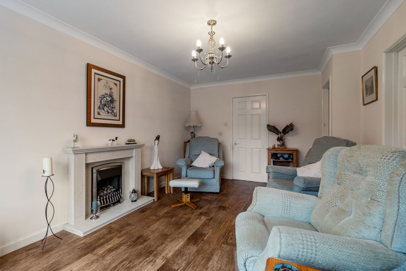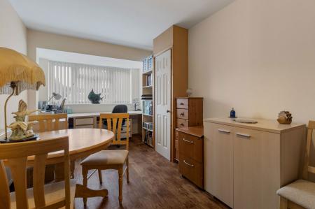 Originally an integral garage but now converted into a useful reception room. With double radiator. Fitted cupboard. Large fitted desktop and drawers. Wood effect flooring. Double glazed window to front.