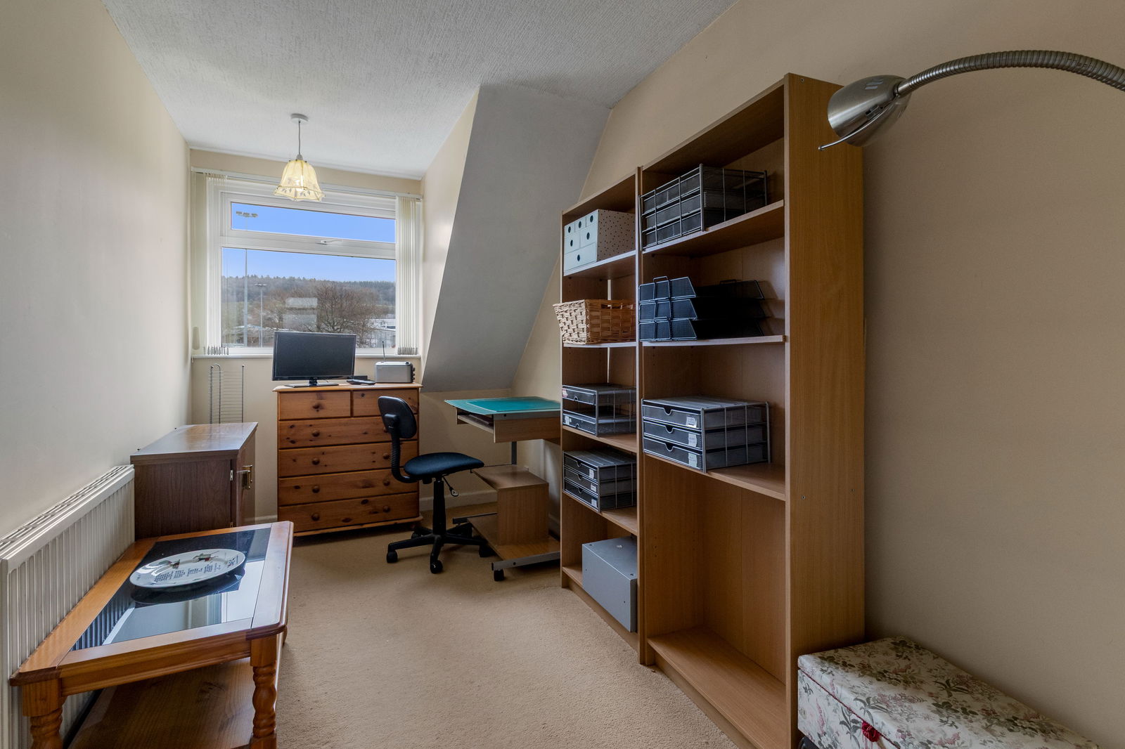 Having a built-in cupboard with hanging rail. Single radiator. Double glazed window to front with distant views.