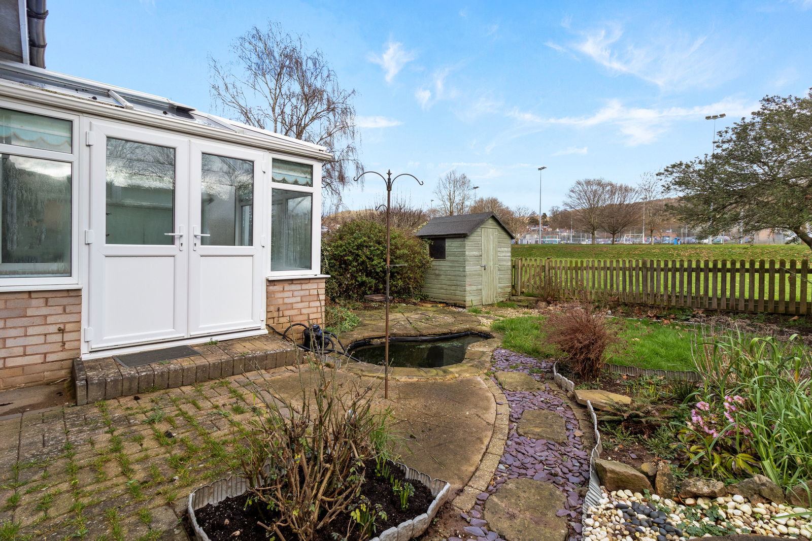 A gated pathway to the side of the house leads to an enclosed rear garden which overlooks school playing fields and is pleasantly arranged with a terrace, ornamental pond, area of lawn and flowerbeds.