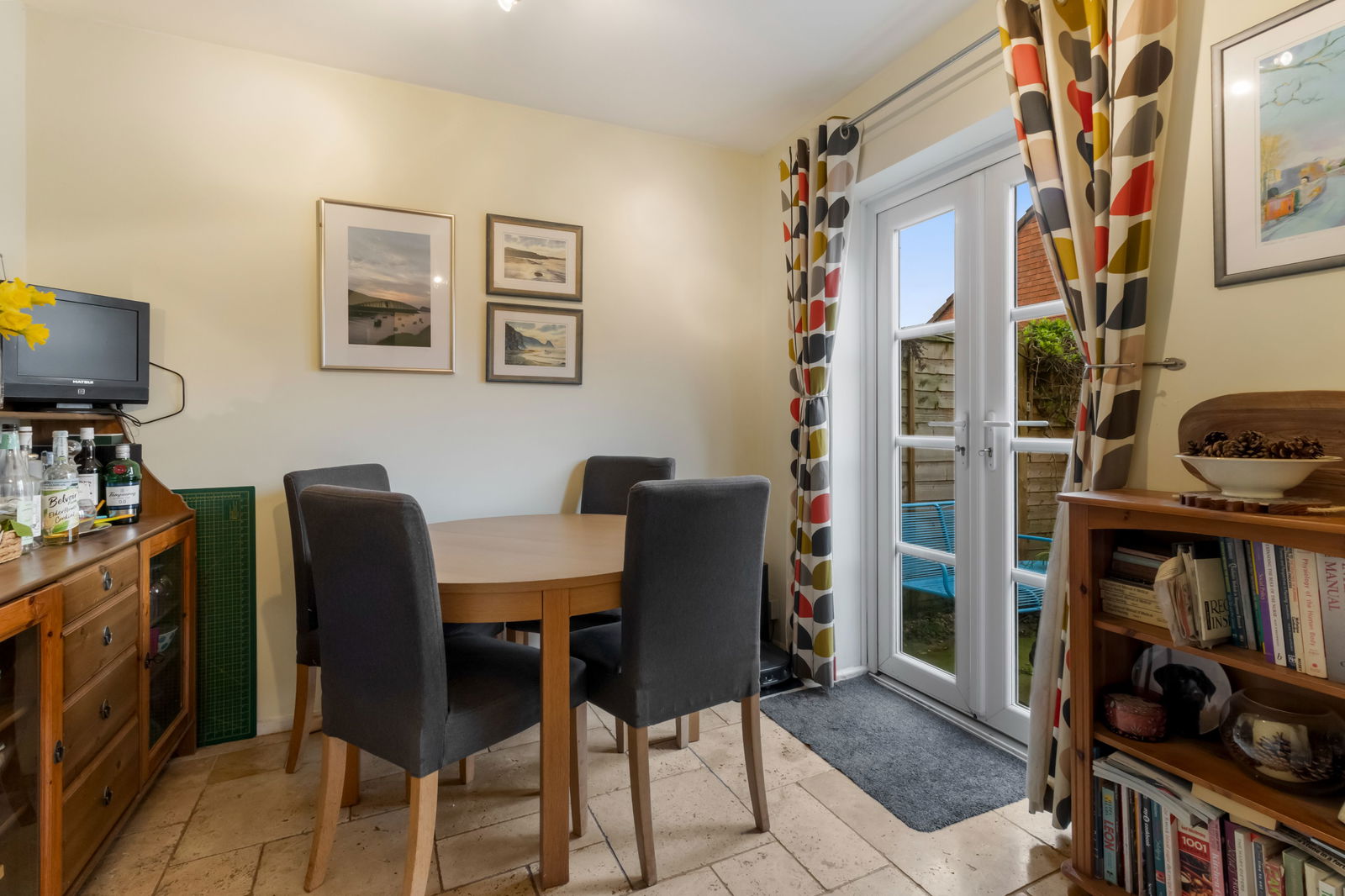 With ceiling light point. French doors opening onto garden patio. Tiled flooring with electric underfloor heating. Radiator. Space for dining Table. Leading through an archway into Kitchen area.