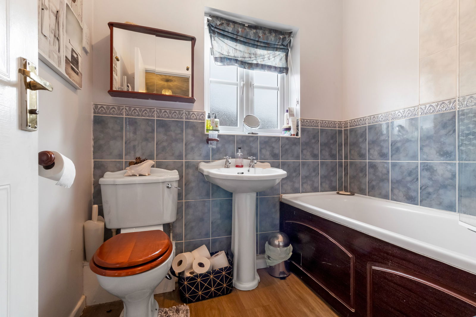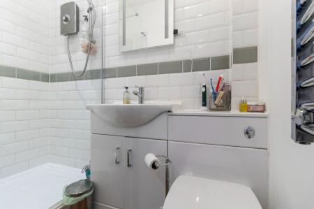 With ceiling light point. Panelled bath with main powered over head shower and a tiled surround. Obscure double glazed window to the side aspect with fitted blinds. Low level toilet. Chrome heated towel rail. Ceramic sink. Wood effect laminate flooring.