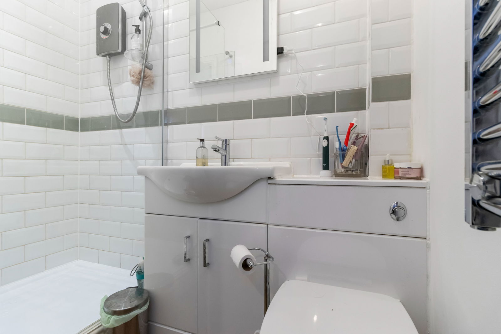 With ceiling light point. One spot down light. Walk in double shower with electric over head power shower and a tiled surround. Sink with chrome mixer tap and a tiled backsplash. Low level toilet. Electric chrome heated towel rail. Extractor fan. Wood effect laminate flooring.