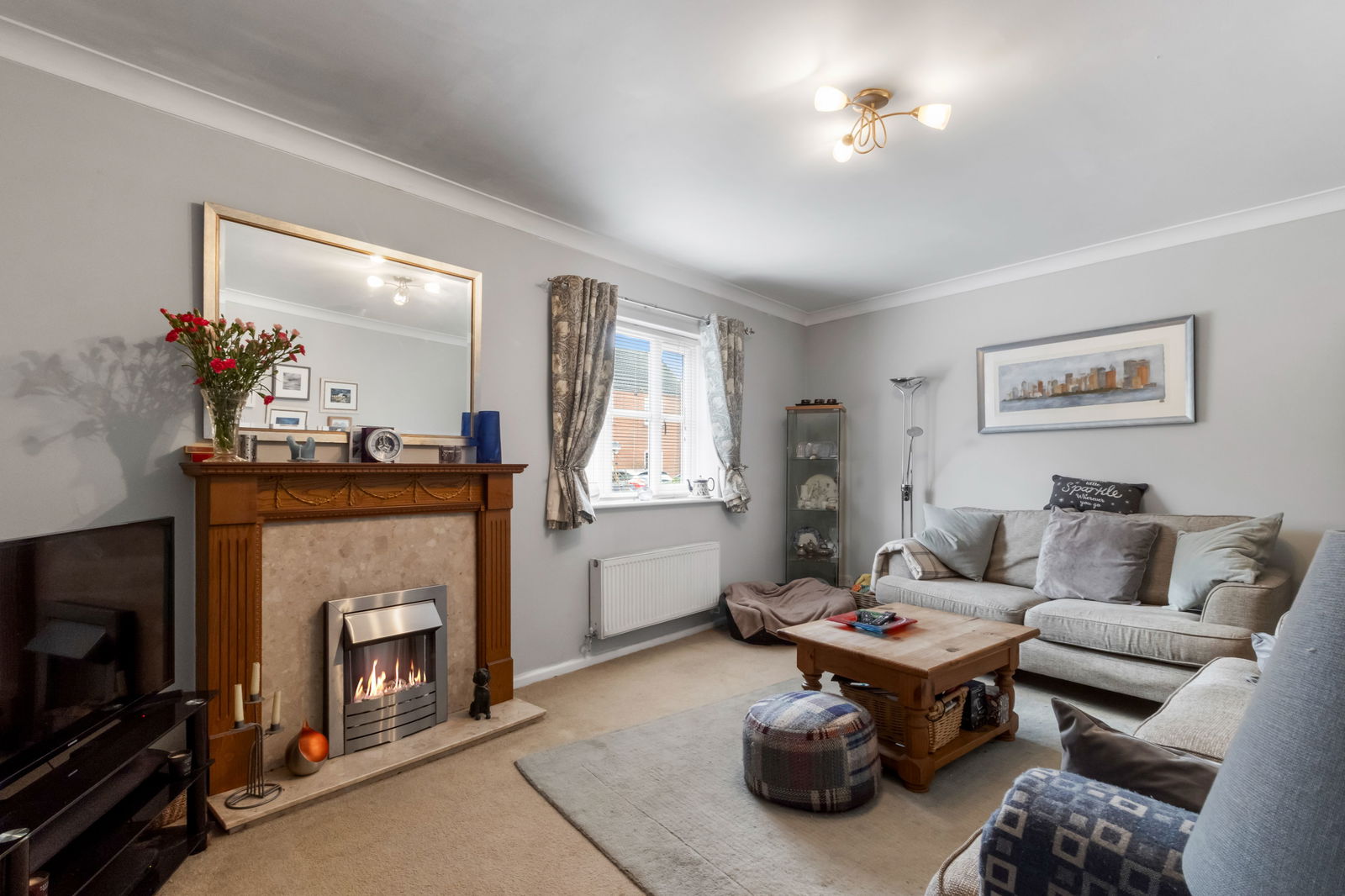 A spacious family room with double glazed window to the side aspect with fitted blinds. Ceiling light point. Radiator. Carpet.