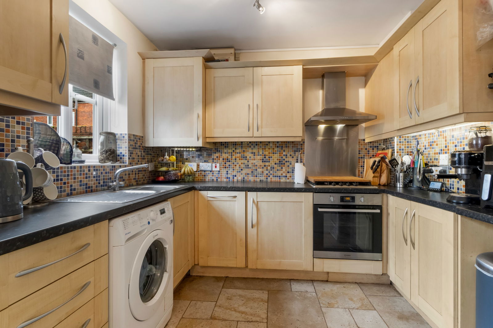 With a range of wall and base units and a granite effect laminate work top and tiled backsplash. Inset stainless steel sink and draining unit. 4 ring gas hob and undercounter electric double oven. Fitted slim line dishwasher, integrated fridge, space for washing machine.