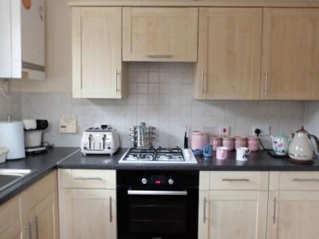 Strip lighting. A range of over head and undercounter cupboards with a vinyl worktop. Inset stainless steel sink and half sink unit with drying rack and tiled backsplash. Wooden framed double glazed rear door leading onto the driveway. Integrated 'Bosch' Electric oven and 4 ring gas hob. Built in extractor fan. Space for washing machine. Space for Fridge/Freezer Glow worm boiler. Consumer unit. radiator. Vinyl flooring.