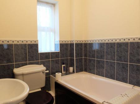 Ceiling light point. Wooden framed obscure glass double glazed window to the front aspect. Panelled bath with chrome taps. Low level toilet. Ceramic sink with chrome taps and tiled backsplash. Radiator. Carpet. Extractor fan.