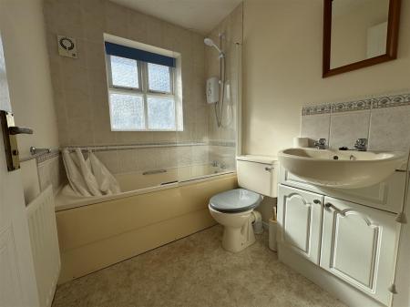 Bathroom - Three piece suite comprising panelled bath, WC, wash hand basin with cupboards below, shaver point, Triton electric shower over the bath with glazed screen, single radiator, tiled splashbacks, extractor fan, rear aspect frosted window.