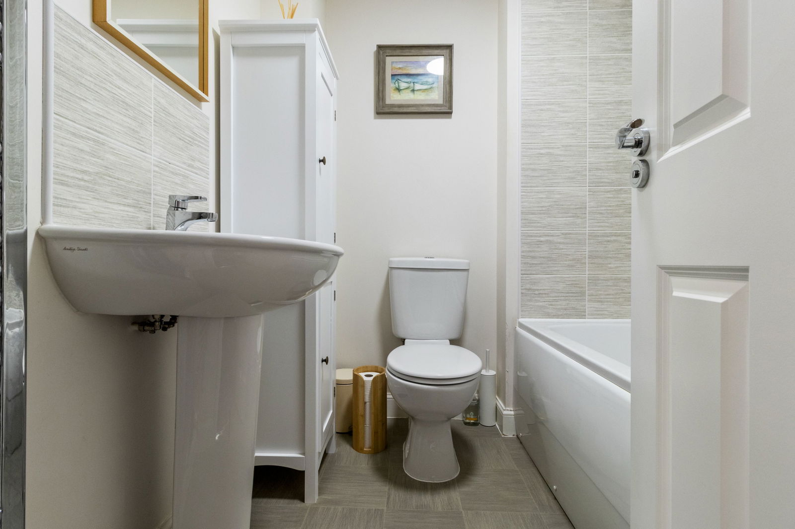 With ceiling light point. Panelled bath with over head mains powered shower and a tiled surround. Ceramic sink and chrome mixer tap. Chrome heated towel rail. Low level toilet. Tile effect vinyl flooring. Extractor fan.
