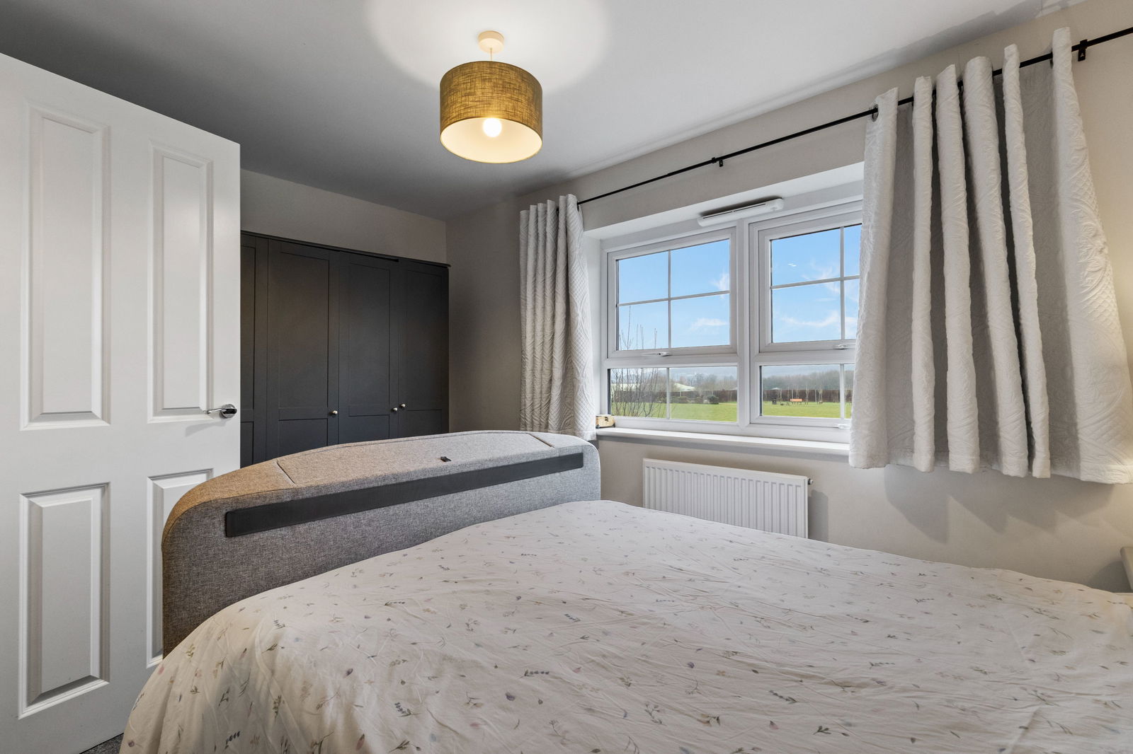 A spacious double bedroom with double glazed window to the front aspect and an open view across green space. Ceiling light point. Radiator. Carpet.
