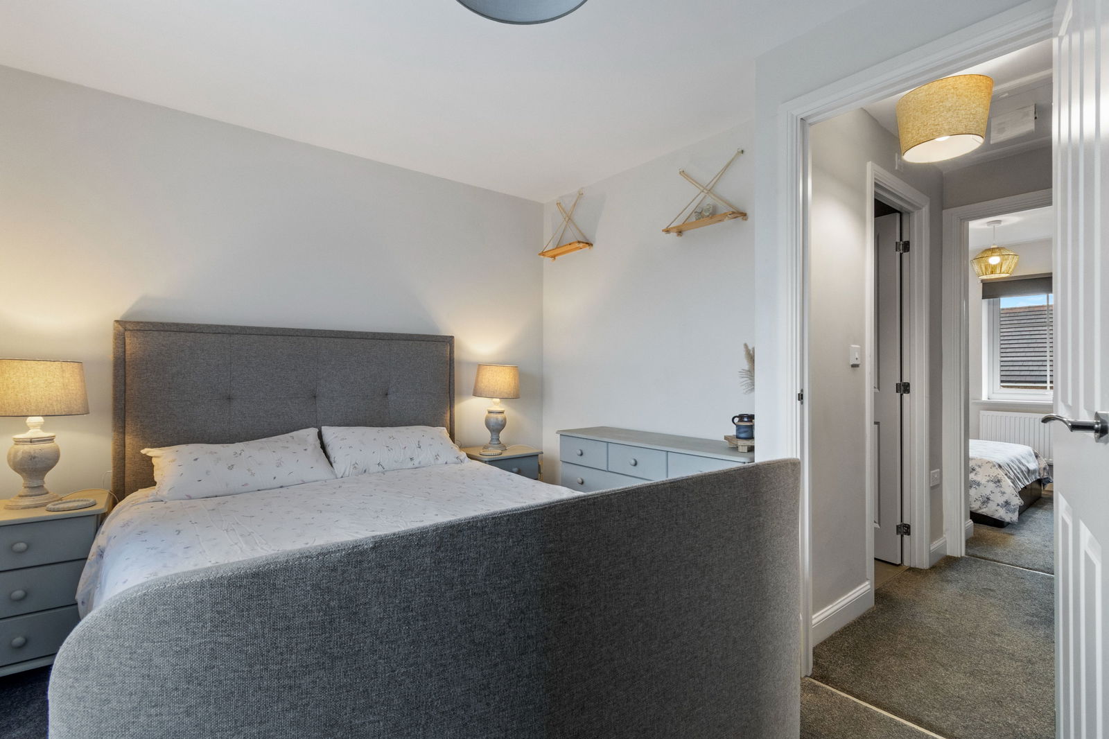 A further double bedroom with double glazed window to the rear aspect with fitted blinds. Ceiling light point. Built in over stairs storage cupboard. Radiator. Carpet.
