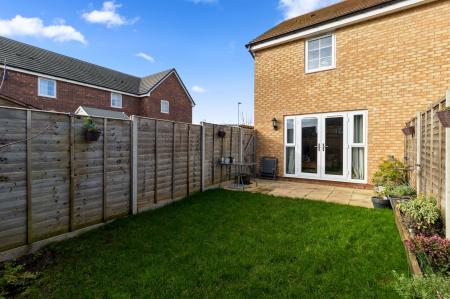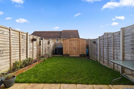 A rear paved patio in front of an area laid to lawn with a well stocked raised border to the left hand side. with a useful metal garden shed to the far corner, offering excellent garden storage. Gated side access onto a shared paved path leading to the front garden and driveway.