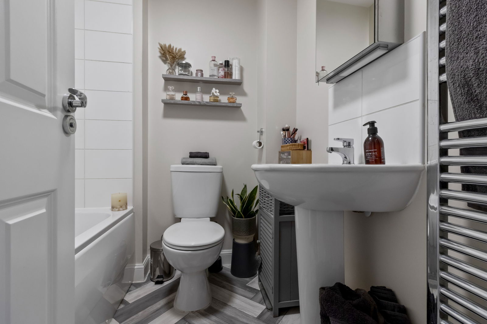 With panelled bath with over head mains powered rainfall shower and a tiled surround. Ceiling light point. Ceramic sink with chrome taps. Low level toilet. Chrome heated towel rail. Tile effect vinyl flooring. Extractor fan.