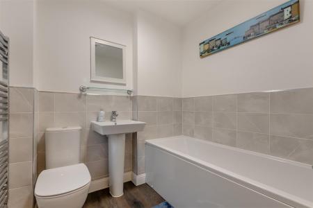 Family Bathroom - 2.01m x 1.88m (6'07 x 6'02) - Three-piece white suite comprising panel bath with mixer tap, pedestal wash hand basin with mixer tap, w.c, laminate flooring, tiled splashbacks, chrome heated towel rail, extractor fan, rear aspect frosted window.