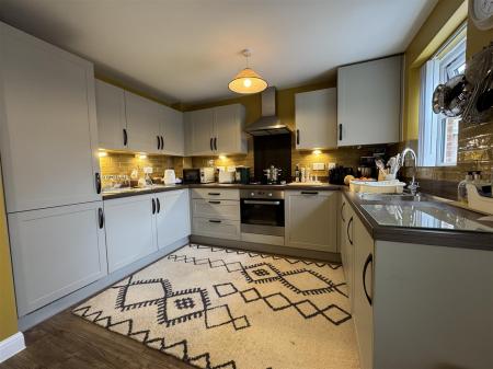Kitchen / Diner - 4.70m x 3.35m (15'5 x 11'0) - Modern fitted kitchen with a range of base and wall mounted units, laminated worktops and tiled splashbacks, integrated fridge / freezer, Zanussi oven with four ring gas hob, glass splashback and extractor fan, integrated dishwasher and washing machine, wood effect flooring, double radiator, rear aspect window, UPVC double glazed sliding doors into: