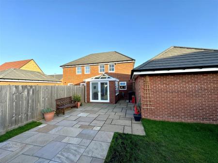 Pedestrian gated access from the driveway, leads to the rear gardens which measure 40' x 35'. The gardens have recently been landscaped to comprise large Indian sandstone patio seating area and outside water tap. The garden extends behind the garage to provide further lawned area and the garden is all enclosed by wood panel fencing.