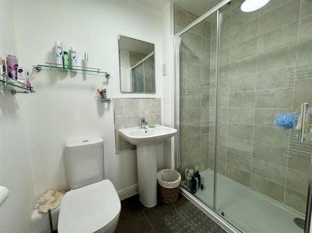 En-Suite Shower Room - 2.06m x 1.35m (6'9 x 4'5) - Double shower cubicle accessed via sliding glazed screen, fully tiled walls, Mira electric shower system, pedestal wash hand basin with mixer tap, WC, shaver point, extractor fan, heated towel rail.