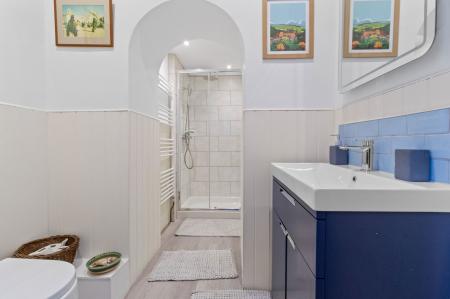 Recently-fitted with tiled walk-in shower with mixer shower. WC. Vanity unit with inset wash hand basin, mixer tap and mirror over. Half wall panelling. Brampton Chase LVT wood-effect flooring. Radiator. Electric towel rail. Extractor fan.