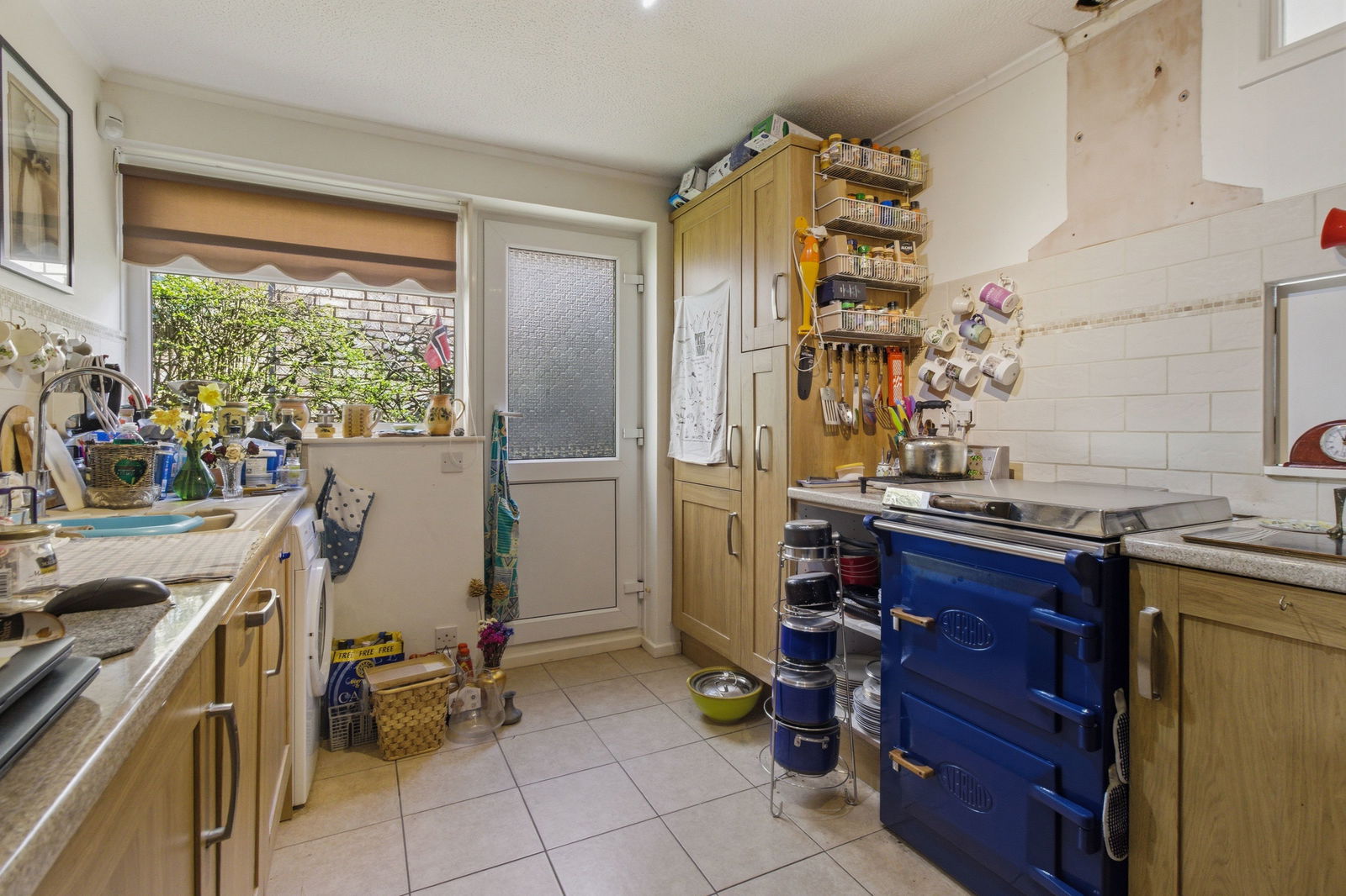 Fitted with a range of contemporary wooden units comprising a composite 1½ bowl sink with base unit under. Further base units. Tall storage cupboard. Work surfaces with tiled surrounds. Integral fridge freezer and dishwasher. Plumbing for washing machine. Tiled floor. Double glazed window and door to side.