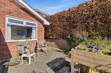 To the front of the property there is a stone hard standing providing off road parking and well stocked flower borders. A block paved driveway to the side provides further off road parking and gives access to a single garage (8'2''x 17'3'') with electric garage door and personal door to the garden. Gateways to either side of the bungalow give access to the enclosed and private south facing rear garden which is pleasantly arranged with a paved terrace, an area of lawn and well stocked borders. There are four fruit trees, apple, pear, damson and quince. There is also a wooden garden shed, outside lights and a cold water tap.