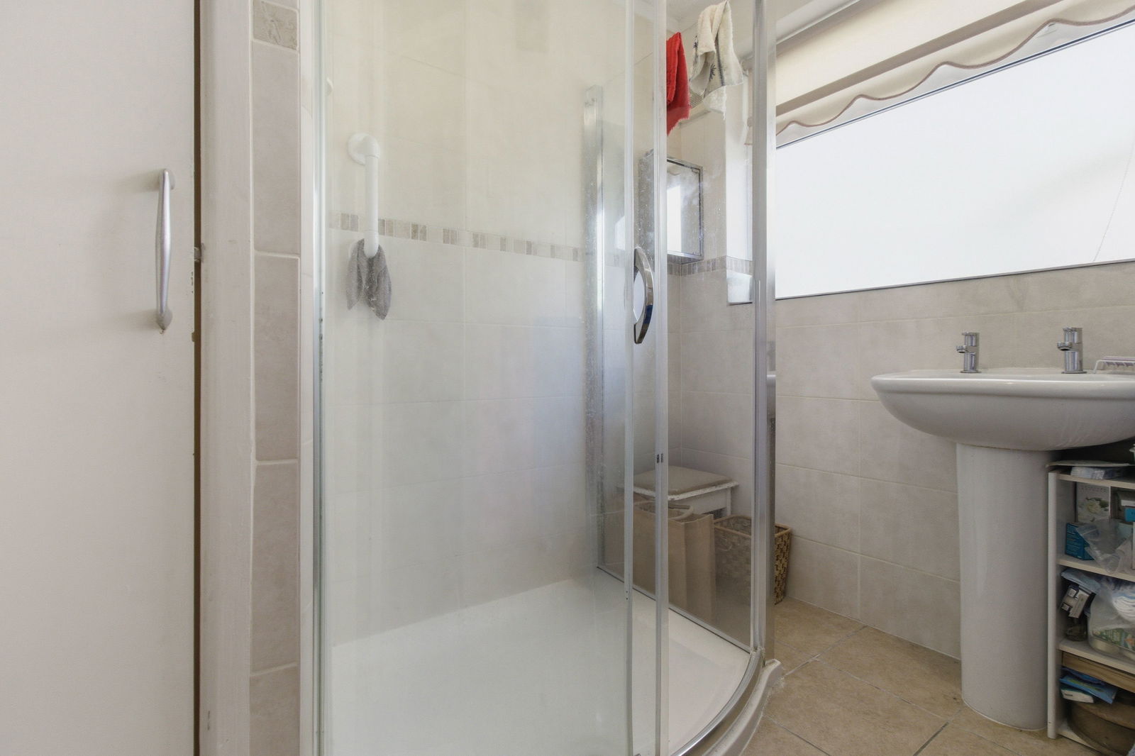 Fitted with a tiled shower cubicle and wash hand basin. Tiled floor. Double glazed window to side.