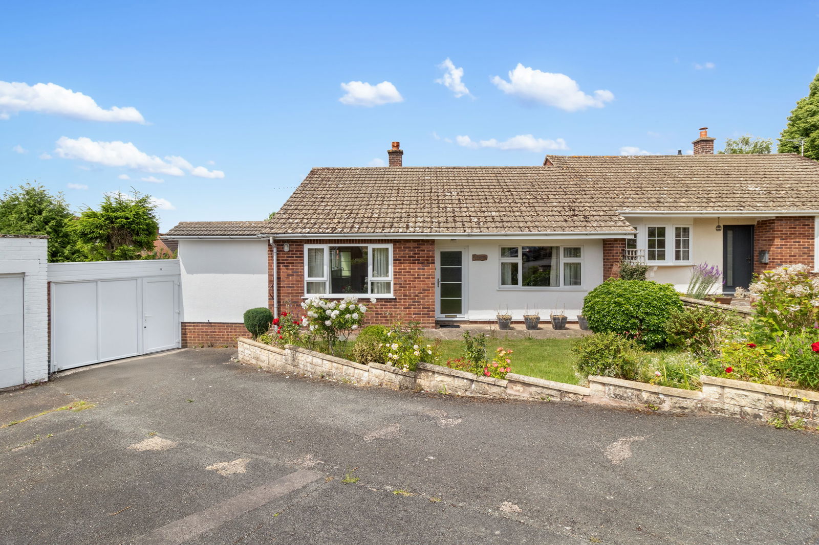 Stepping out into the rear garden, you arrive on a paved patio that leads to an improved and established enclosed garden, mainly laid to lawn with deep, well-stocked borders. The garden also includes a useful water butt, benched seating and gated side access via a shared paved path to the front, where a lawned garden with a colourful, well-planted border adds vibrancy on approach. A shared communal parking area provides two allocated spaces, with maintenance understood to be shared between four properties. There is also a separate garage with a canopy door and pitched-roof storage for additional convenience.