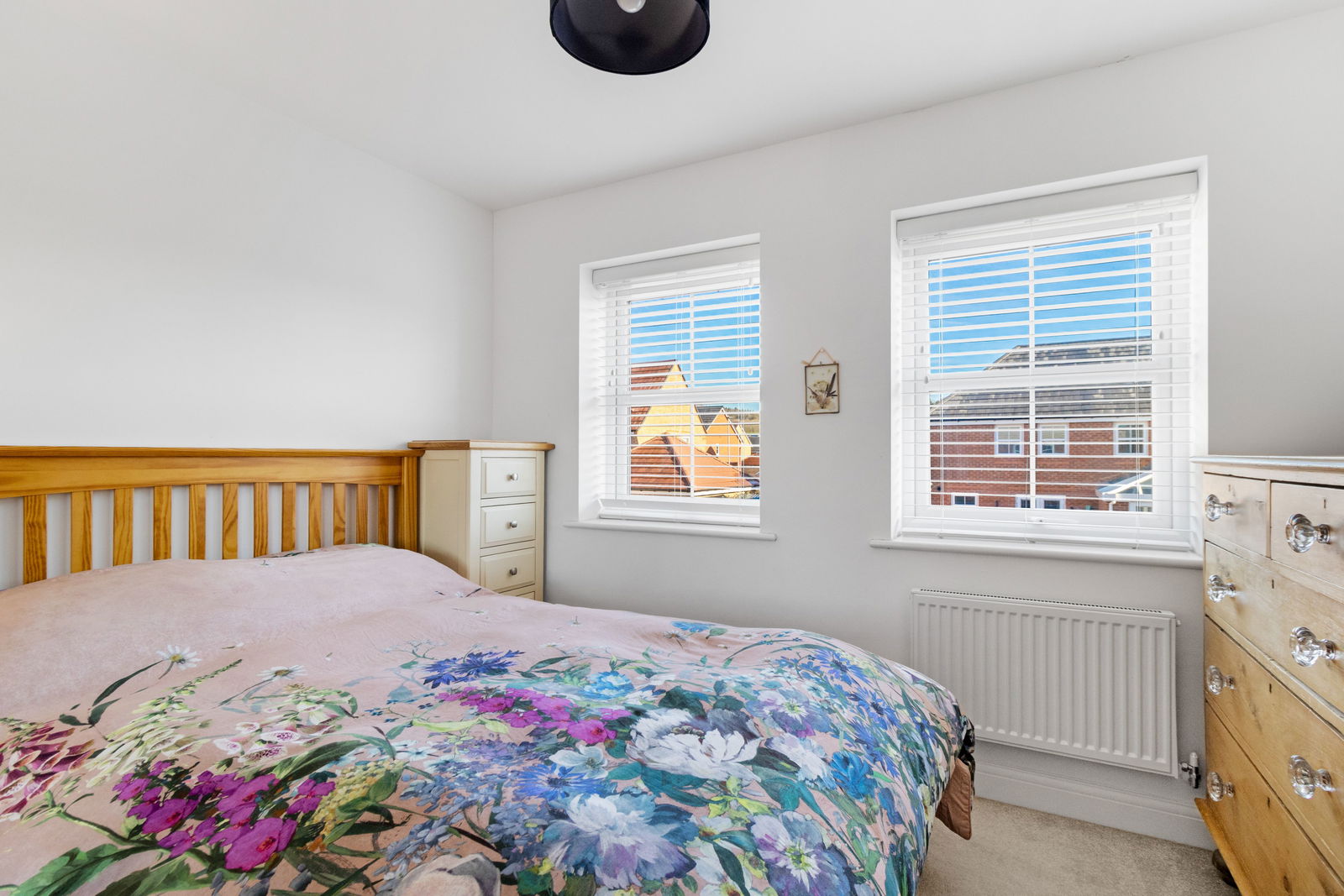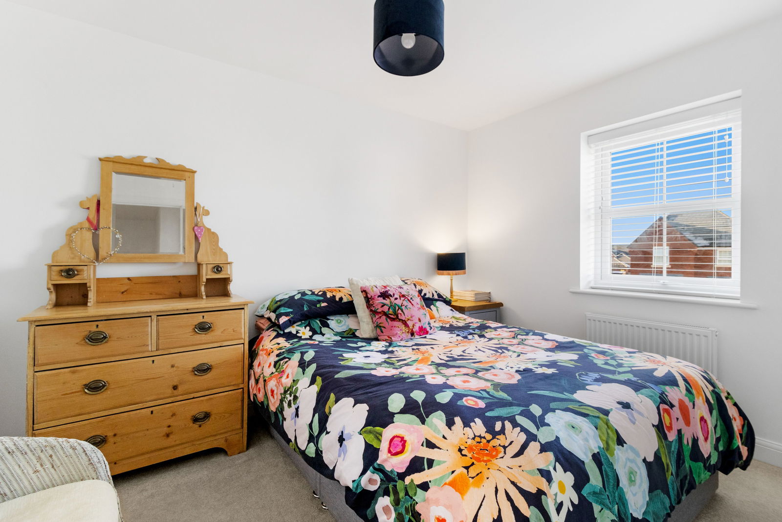 A further double bedroom with double glazed window to the front aspect, with fitted blinds. Ceiling light point. Built in wardrobe. Radiator. Carpet.