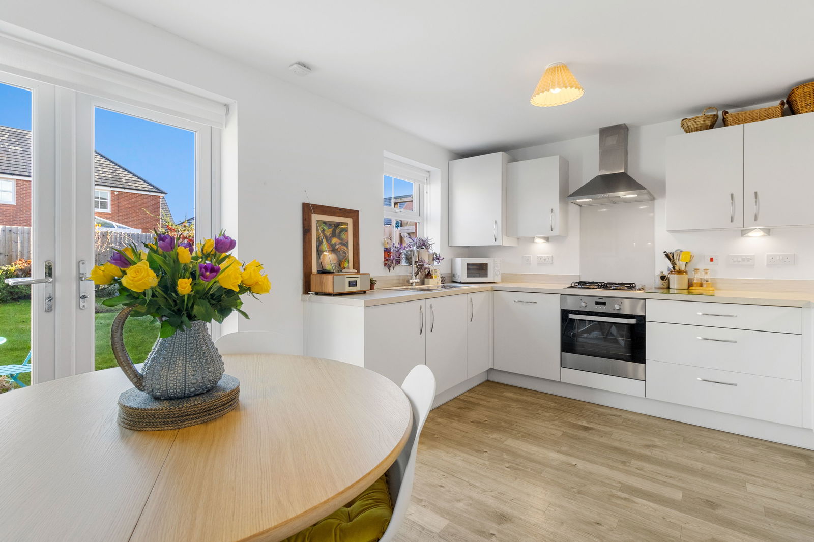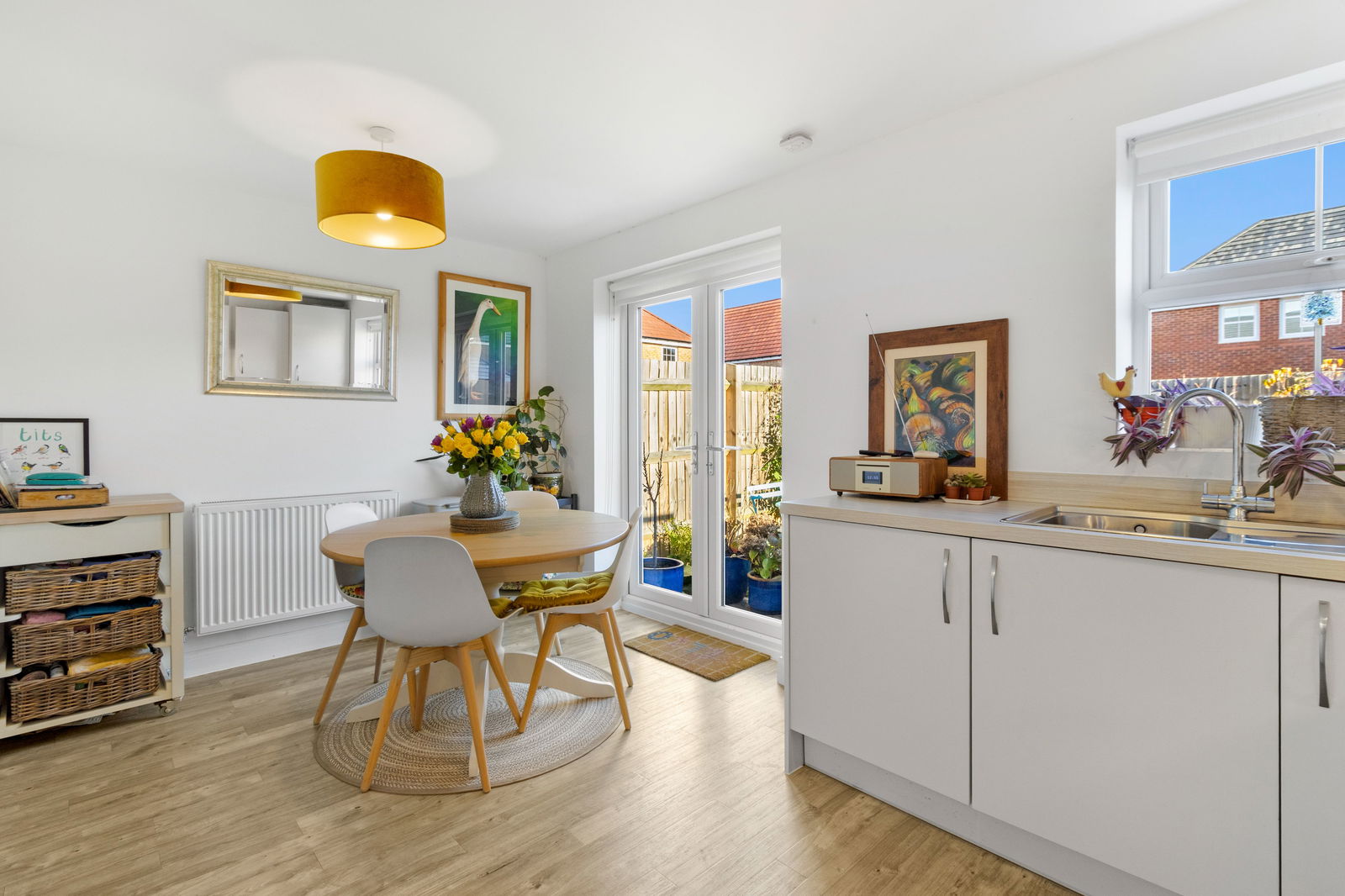 A fully integrated kitchen with 'Zanussi' appliances with a range of wall and base units and a fitted woof effect laminate worktop with inset stainless steel sink and draining unit with a chrome mixer tap. Electric oven and four ring gas hob with over head extractor fan. Integrated fridge freezer, washer/dryer and dishwasher. 'Ideal' combination boiler. Two ceiling light points. French doors with fitted roller blinds and a double glazed window with fitted roller blinds to the rear aspect. Radiator. Space for dining table.