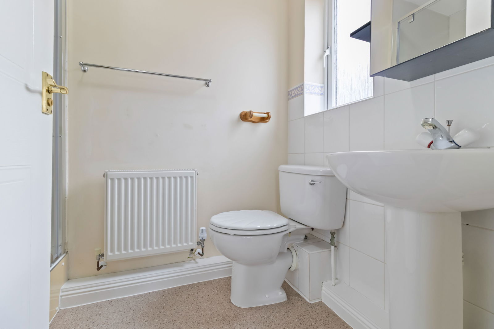 Obscure glazed window to the front aspect. Ceiling light point. Ceramic corner sink with tiled backsplash. Low level toilet. Tile effect vinyl flooring.