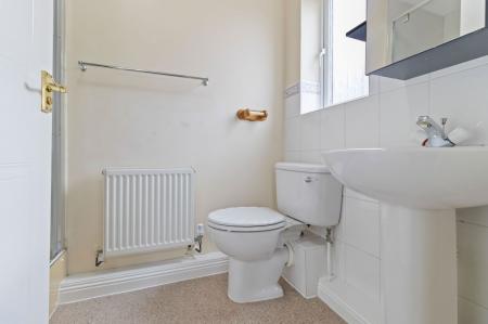 Ceiling light point. Extractor fan. Obscure double glazed window to the side aspect. Shower cubicle with mains powered over head shower with a panelled surround. Sink with tiled surround. Low level toilet. Radiator. Tile effect vinyl flooring.