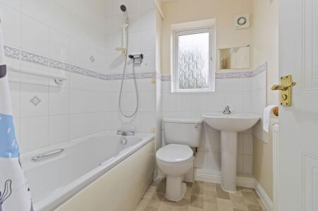 Ceiling light point. Extractor fan. Obscure glazed window to the rear aspect. Panelled bath with over head mains powered shower and a tile surround. Ceramic sink with tiled surround. Low level toilet. Radiator. Tile effect vinyl flooring.