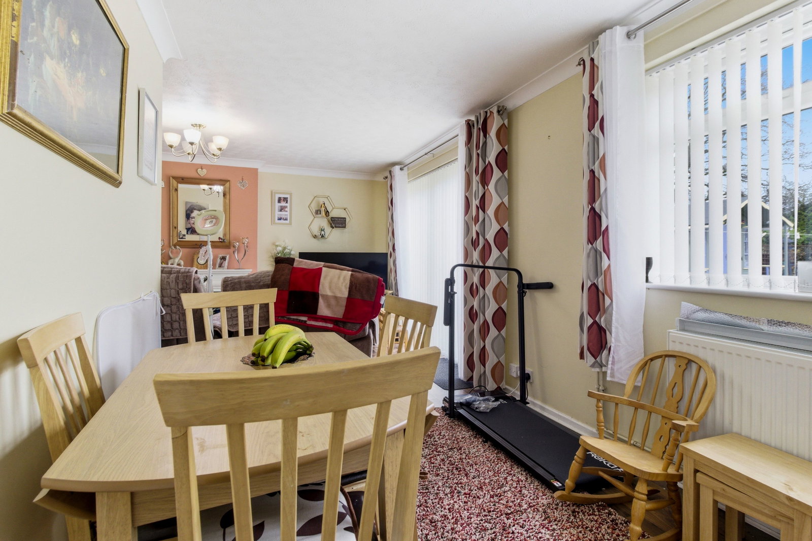 "L" Shaped room with double glazed patio doors opening onto the private garden and double glazed windows to side and rear. Feature fireplace with electric fire (gas point available but disconnected) Central light. TV point. Dining area with part glazed door opening to the kitchen.