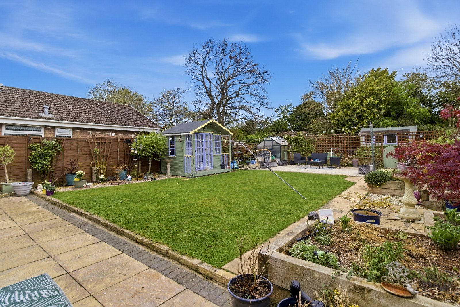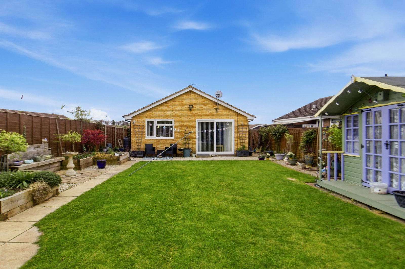 The property is accessed via a driveway which leads to a single garage with personal door, light and power. The front garden is laid to lawn with attractive flowerbeds and borders. Gated rear access to both sides of the property leads to the generous and private level garden offering paved seating areas, beds and borders with seasonal planting and for the keen gardener a vegetable area with raised beds. There is a greenhouse, garden shed and summer(with power connected) included in the sale. Outside tap connected.
