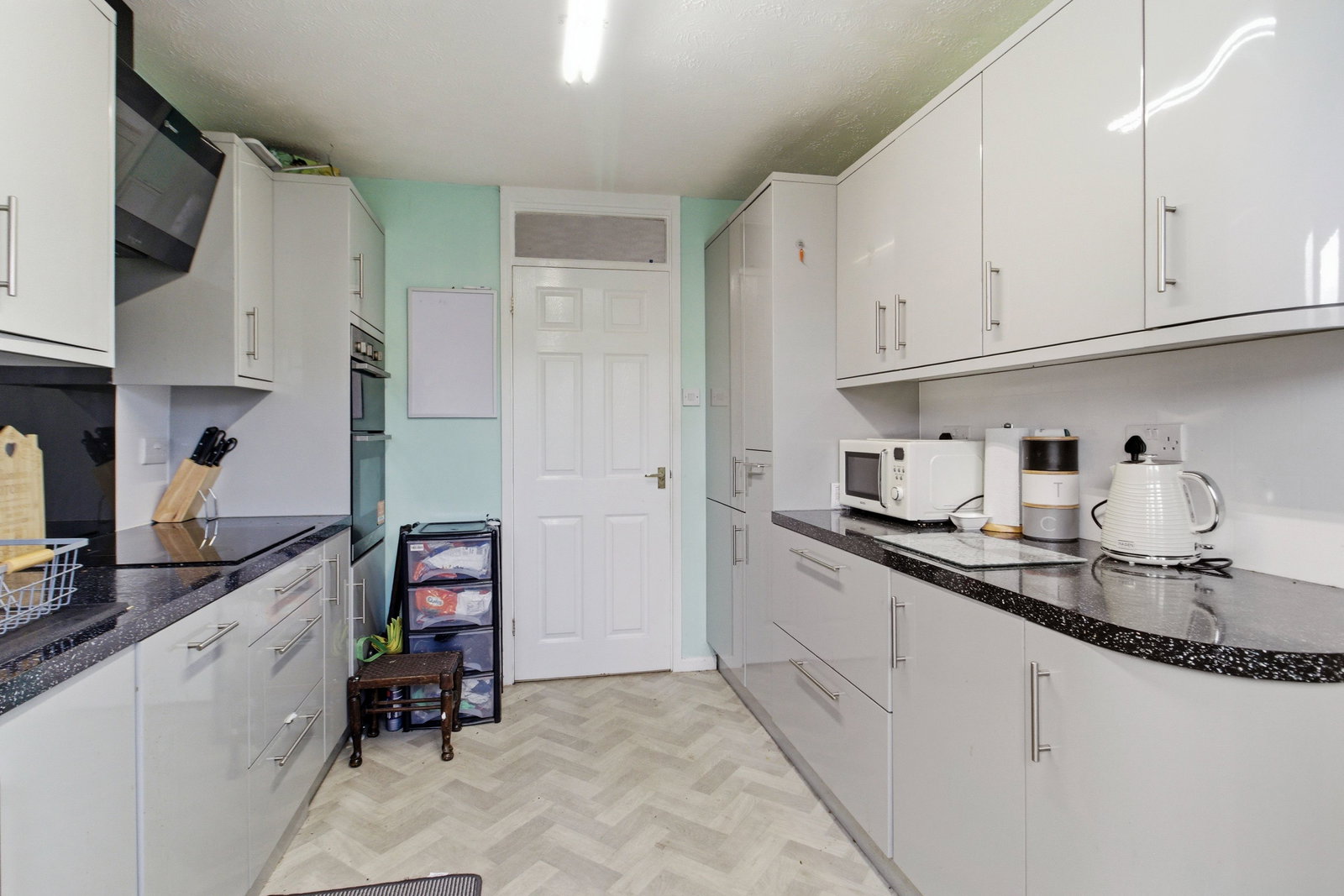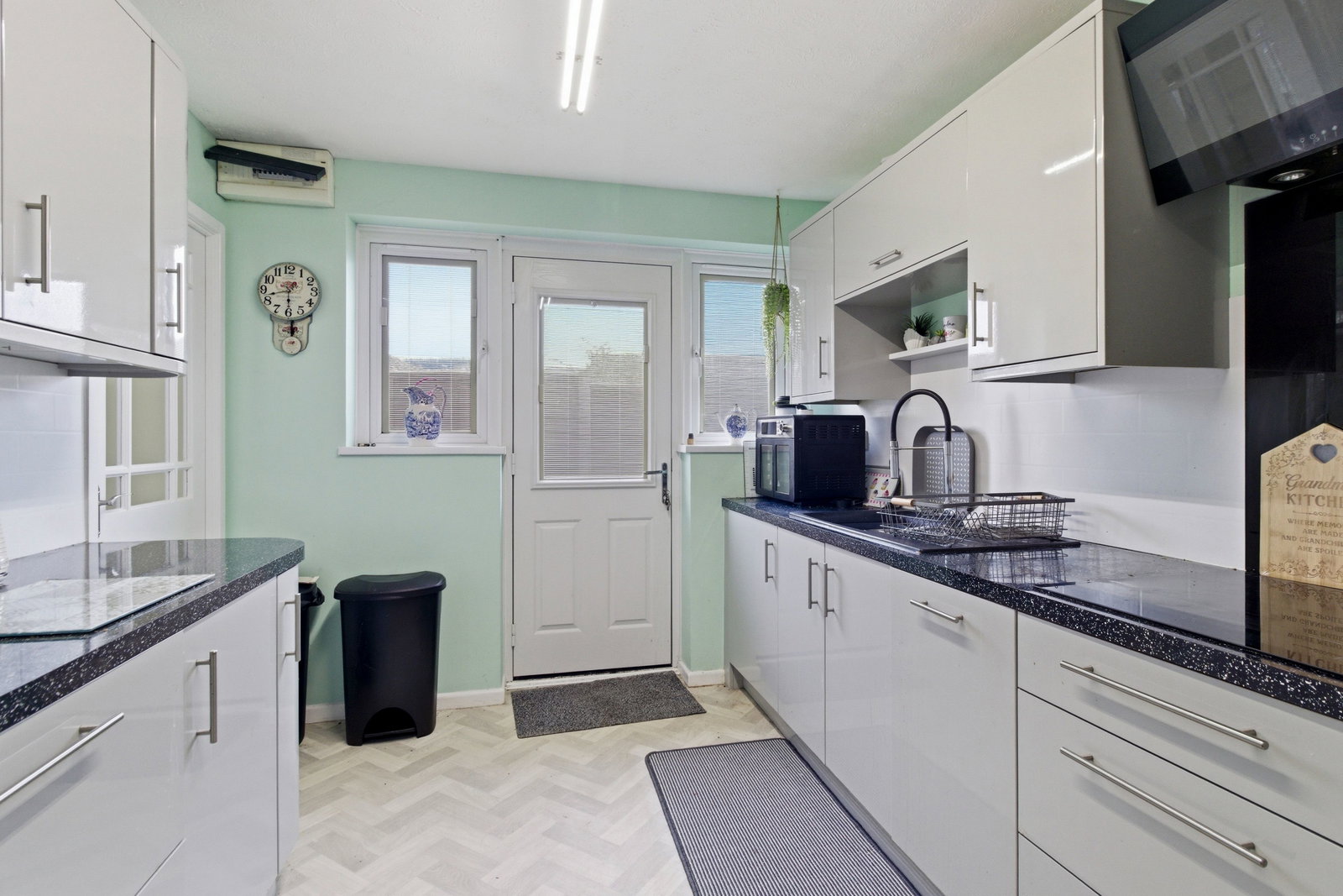 Fitted with a range of contemporary semi-gloss wall and base units with granite effect countertops over. Sink unit with mixer tap. A range of integrated appliances including FRIDGE FFREEZER, WASHINH MACHINE and DISHWASHER. Induction HOB with extractor over. Electric eye-level double OVEN. Double glazed door and windows to side with fitted blinds. Wood effect flooring.