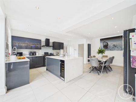 The kitchen has been extended to offer an exceptional range of modern, grey high gloss wall and base units and island, with Corian worksurfaces and including some integrated appliances, along with ample space for dining and entertaining. There are double doors leading to the superb rear garden.