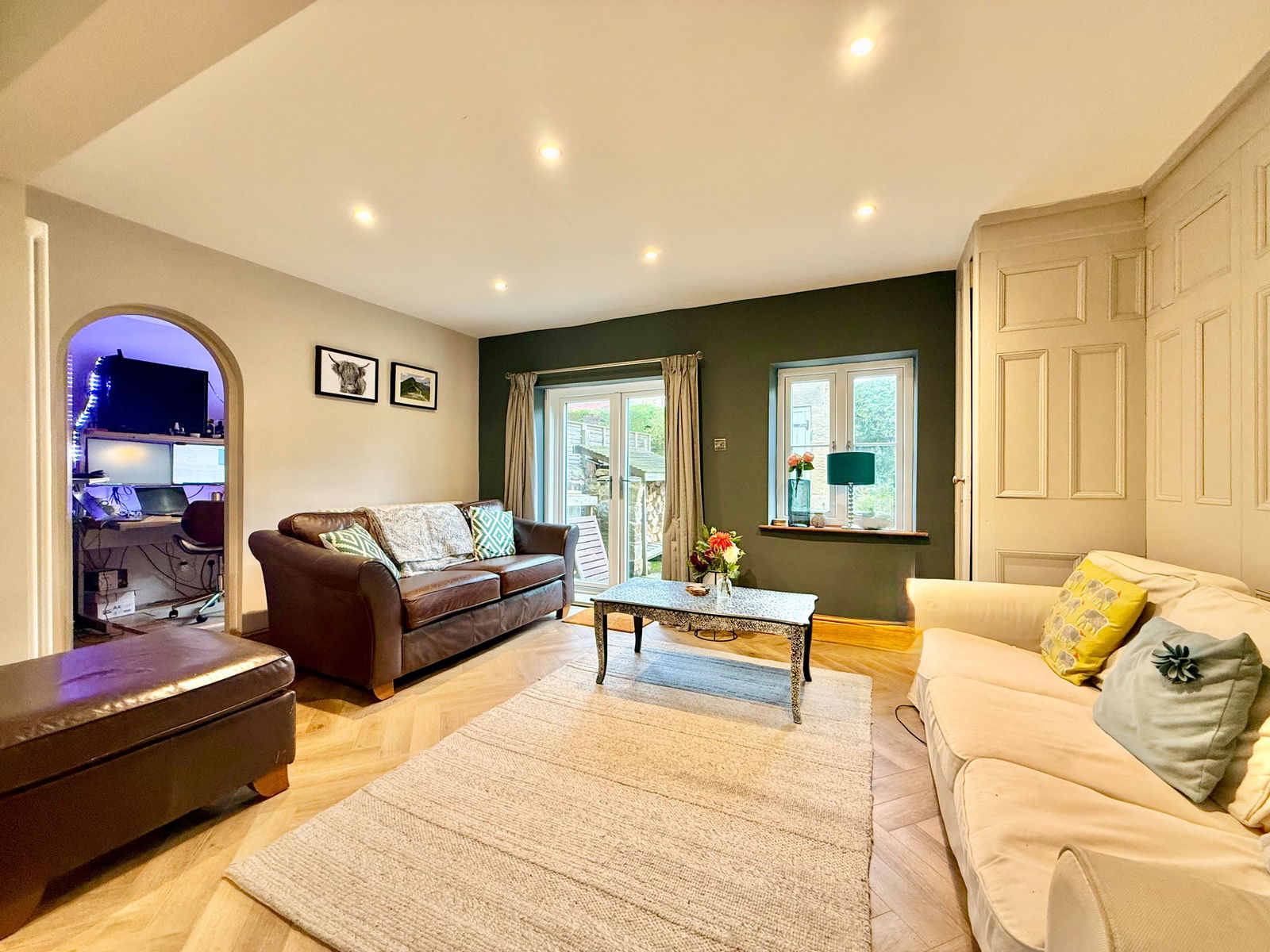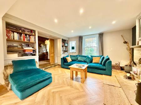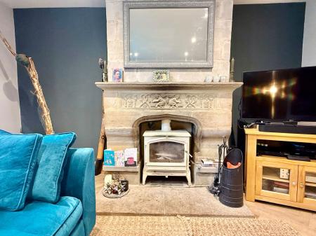 - Spacious living room with wood-burning stove and bespoke cabinetry