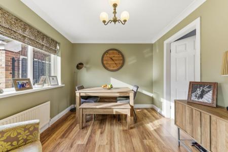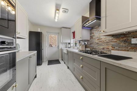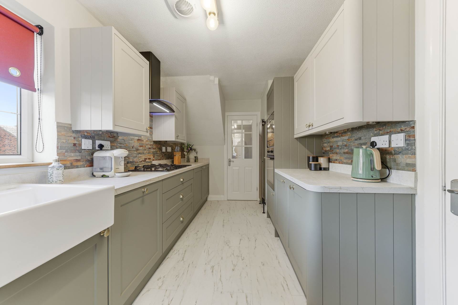 Stepping through the front door, you are greeted by a welcoming and spacious entrance hall. The hallway provides access to a useful understairs storage cupboard and a convenient downstairs WC, which is fully tiled for a sleek, modern finish.also leading to the fully fitted kitchen, which is designed with both practicality and elegance in mind. It features a range of wall and base units, integrated appliances including an oven, microwave, dishwasher, and washing machine, as well as a gas hob and extractor fan. There is also space for a fridge/freezer, complemented by a charming Belfast style sink that adds a touch of character. A side door from the kitchen provides direct access to the driveway, while the space flows seamlessly into the bright and airy dining room. The dining room enjoys an abundance of natural light and opens through double doors into the inviting living room, a spacious and comfortable setting with large sliding doors leading out to the rear garden. This layout creates an effortless connection between indoor and outdoor living, perfect for entertaining or relaxing with family.