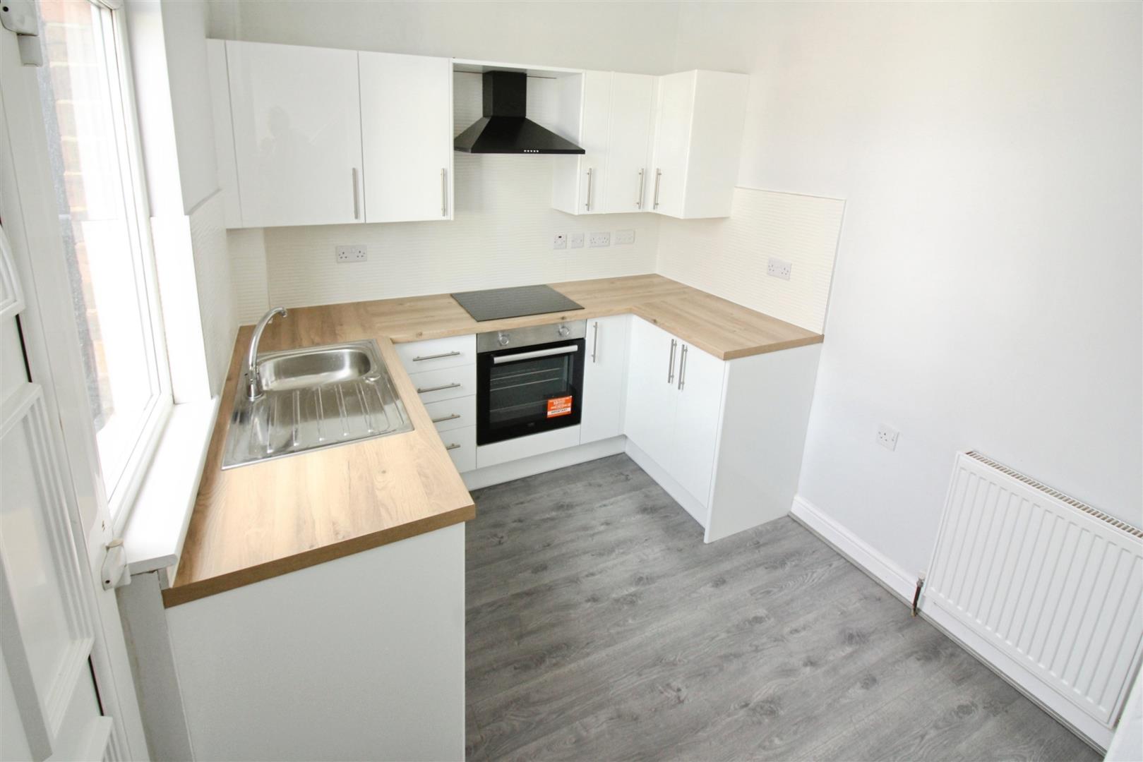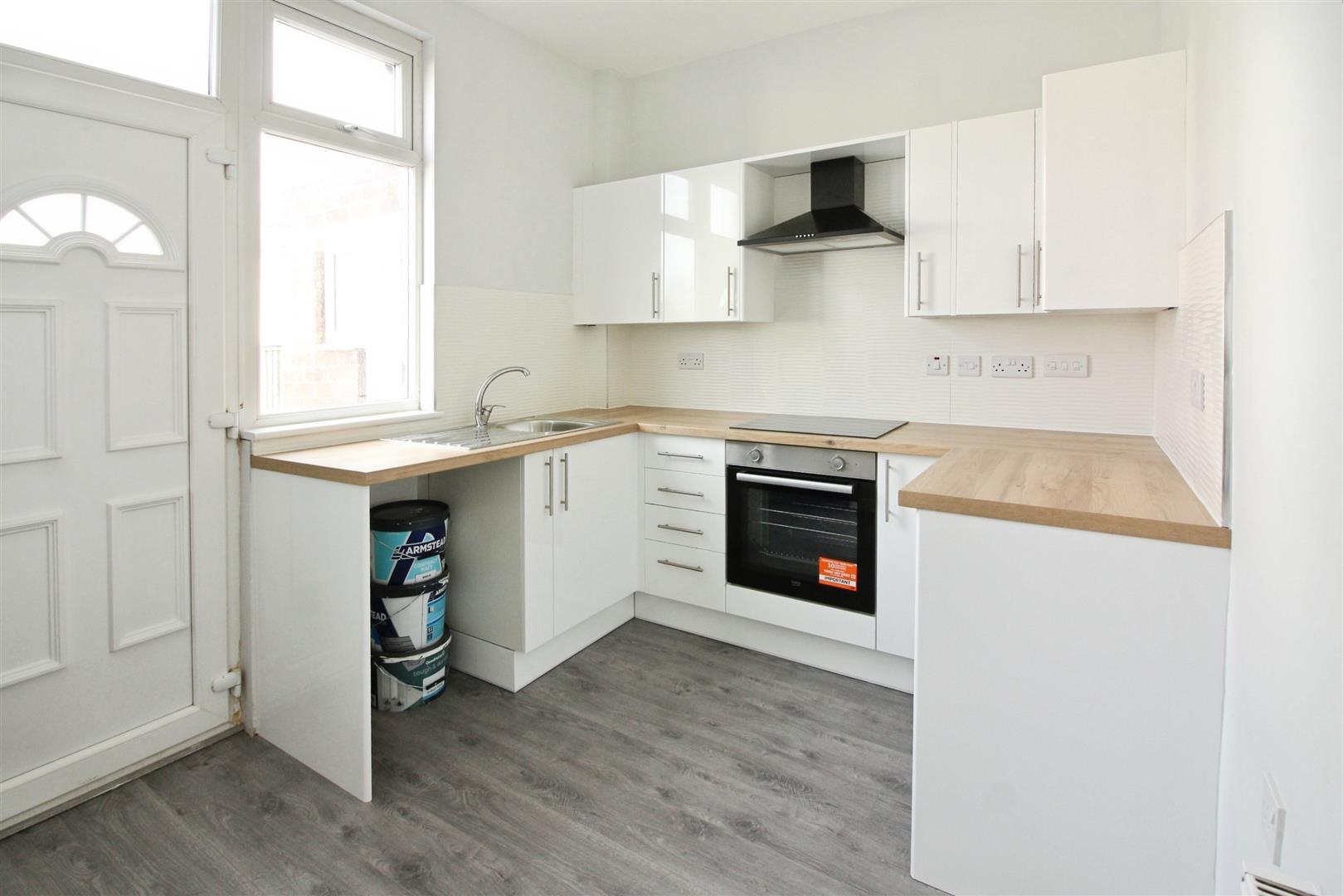 The ground floor features a reception room with laminate flooring and large window to the front, providing a bright and practical living and dining space. The separate kitchen has been replaced with modern white wall and base units with wood grain effect counter tops and integrated cooking appliances, offering a functional area for day-to-day cooking and meal preparation. A door opens from the kitchen and stairs lead down to a useful storage cellar.