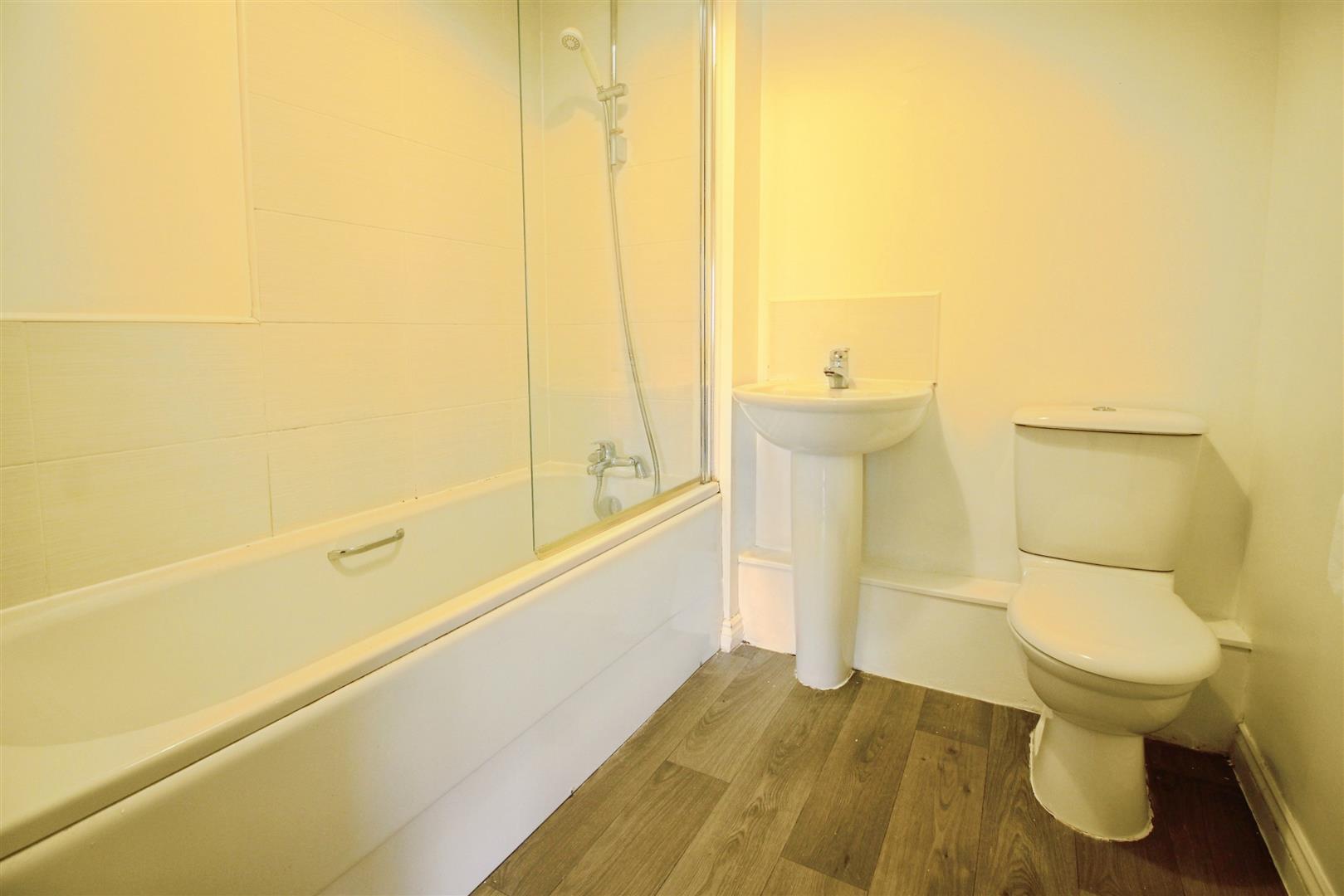 Bathroom - The part-tiled white bathroom suite comprises; panelled bath with shower and glass screen, close coupled WC, a pedestal hand wash basin, vinyl flooring, ladder style towel warmer and an extractor fan.