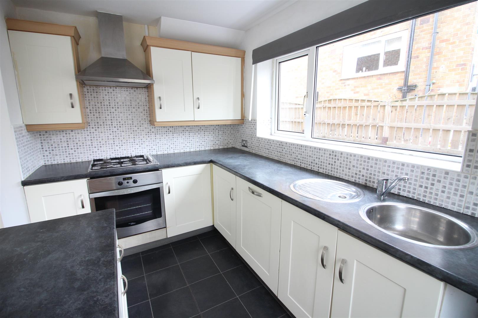 Kitchen - 3.18m x 2.08m (10'5" x 6'10") - Range of base and eye level units with worktop space over and drawers, sink unit with single drainer, plumbing for automatic washing machine and dishwasher, built-in electric oven, built-in gas hob with pull out extractor hood over, double-glazed window to side.