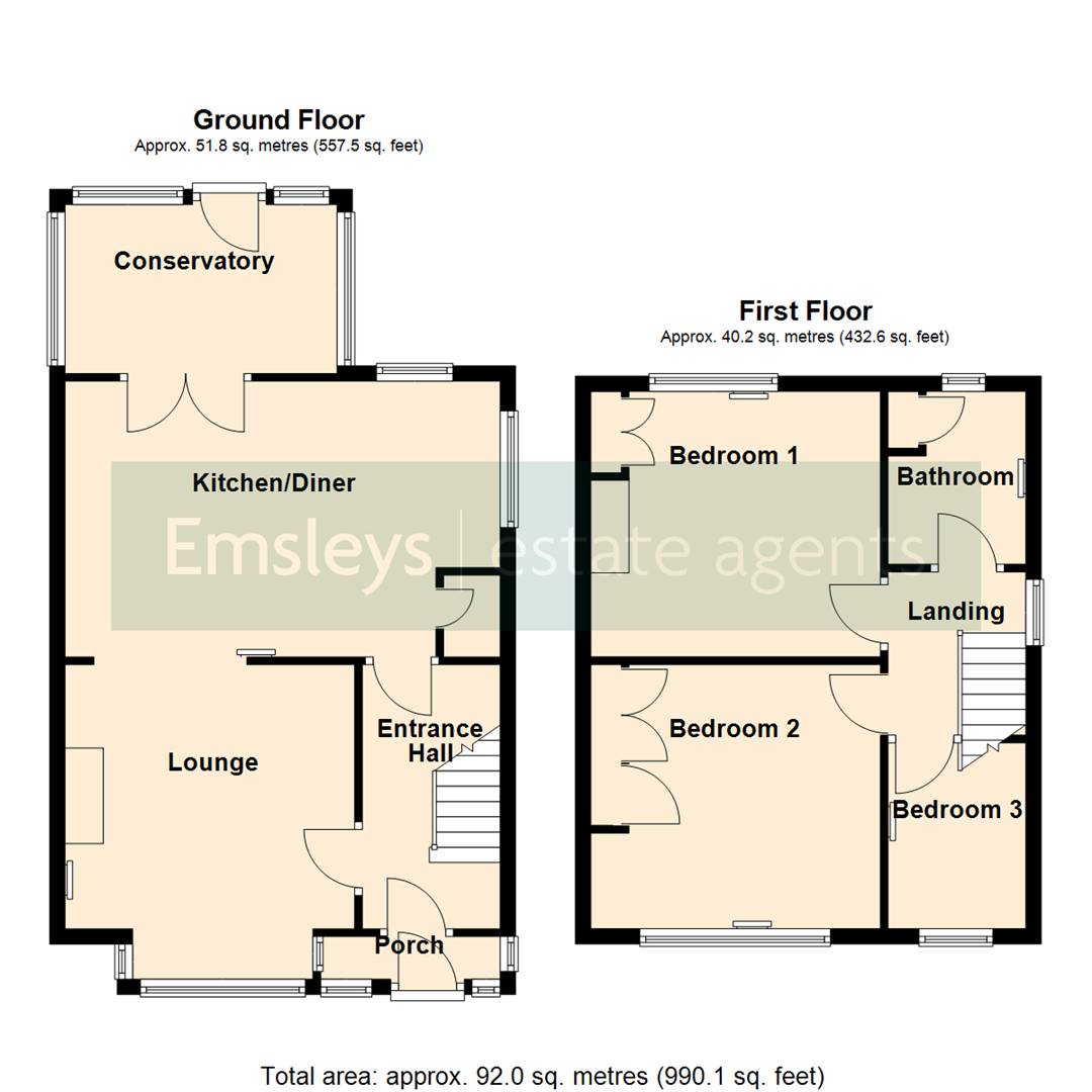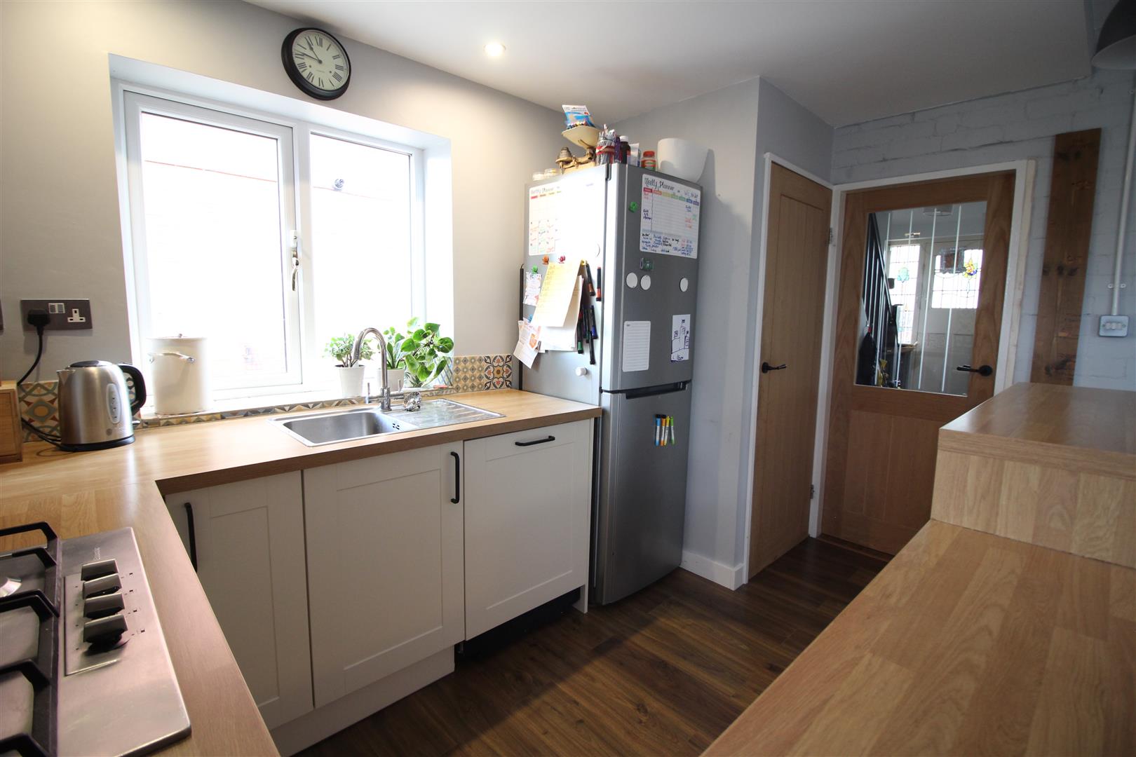 Kitchen/Diner - 3.61m max x 5.69m max (11'10" max x 18'8" max ) - Fitted with a range of base level units with worktop space over and drawers and breakfast bar, stainless steel sink unit with single drainer and mixer tap with tiled splash-backs, integrated dishwasher, built-in electric oven, built-in four ring gas hob with extractor hood over, double-glazed window to side, double-glazed window to rear. Contemporary style radiator, wooden effect laminate flooring, french double door to conservatory, built-in under-stairs storage cupboard which has plumbing automatic washing machine.