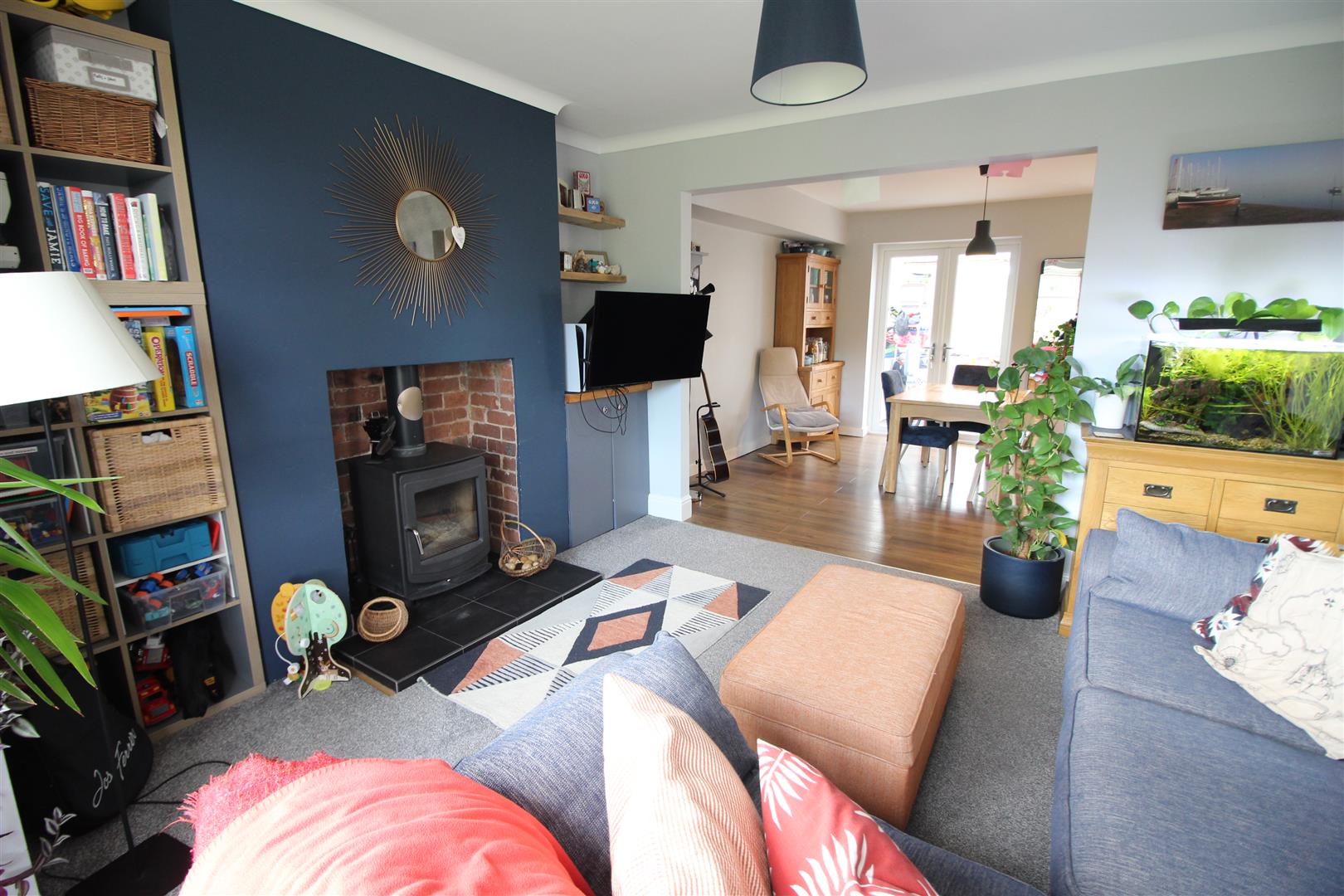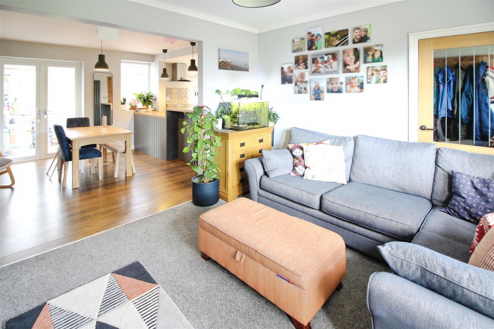 The residence boasts spacious accommodation, designed to maximise natural light and versatility. The lounge features an open-plan layout, highlighted by large characterful box bay window, and a multi- fuel stove-perfect for relaxing evenings. The modern kitchen is open-plan and well-equipped with a built-in hob and oven, integrated dishwasher, ample dining space and a utility cupboard offers additional practicality, making this home as functional as it is stylish. There is a useful conservatory that provides direct access to the large rear garden, creating an inviting space for a play room or peaceful mornings overlooking mature outdoor surroundings.
