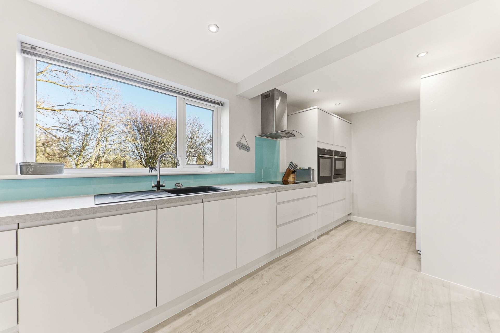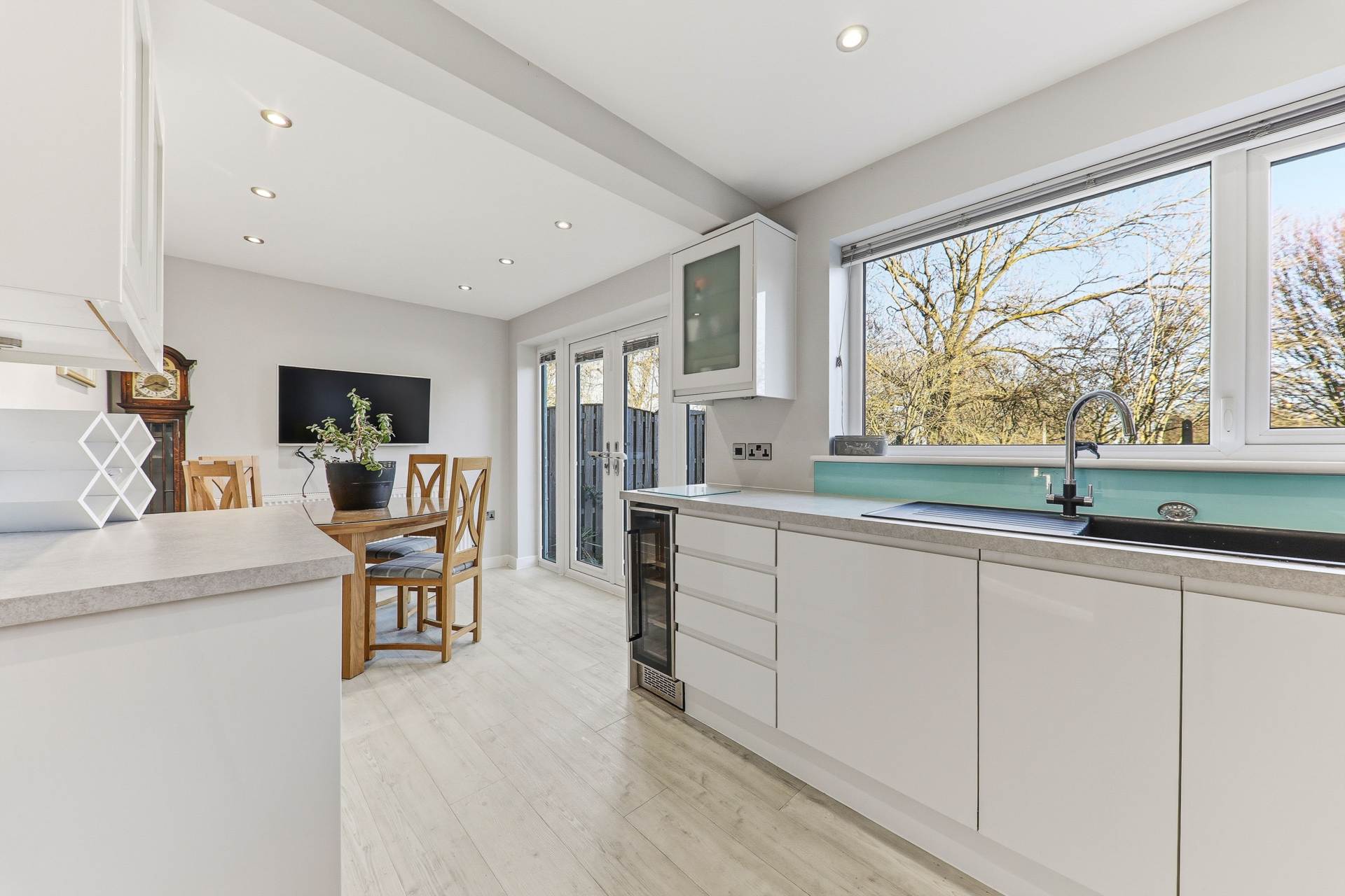 On entrance to the property, you are welcomed into a hallway that provides access to the main living areas, a bright and airy living room, an inviting space ideal for relaxing, with plenty of natural light enhancing the rooms open feel. The hallway also leads into the stunning kitchen diner, which has been thoughtfully designed with both style and functionality in mind. Fully fitted with a range of wall and base units, the kitchen provides ample worktop space and excellent storage. Integrated appliances include a wine cooler, oven, microwave, electric hob with extractor fan, and a dishwasher, giving the room a sleek, high spec finish. The dining area is a real highlight, offering space for a family table and featuring French doors that open onto the rear patio, where you can enjoy a fantastic view across Dartmouth Park. From the kitchen, there is access into a separate utility room with plumbing for a washing machine and dryer, keeping appliances neatly tucked away. The utility also benefits from a separate entrance along with a convenient downstairs shower room, adding flexibility for busy households or visitors.