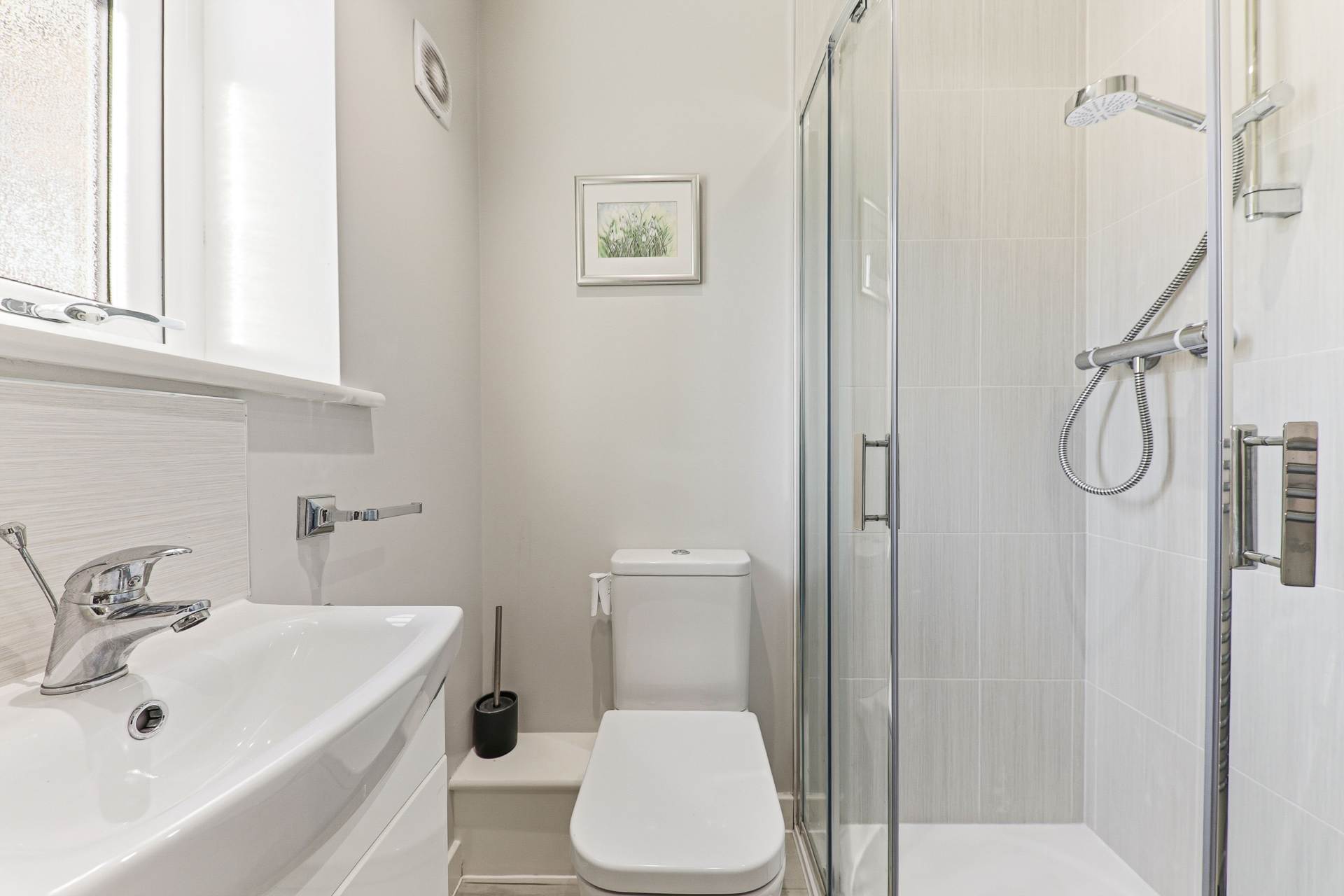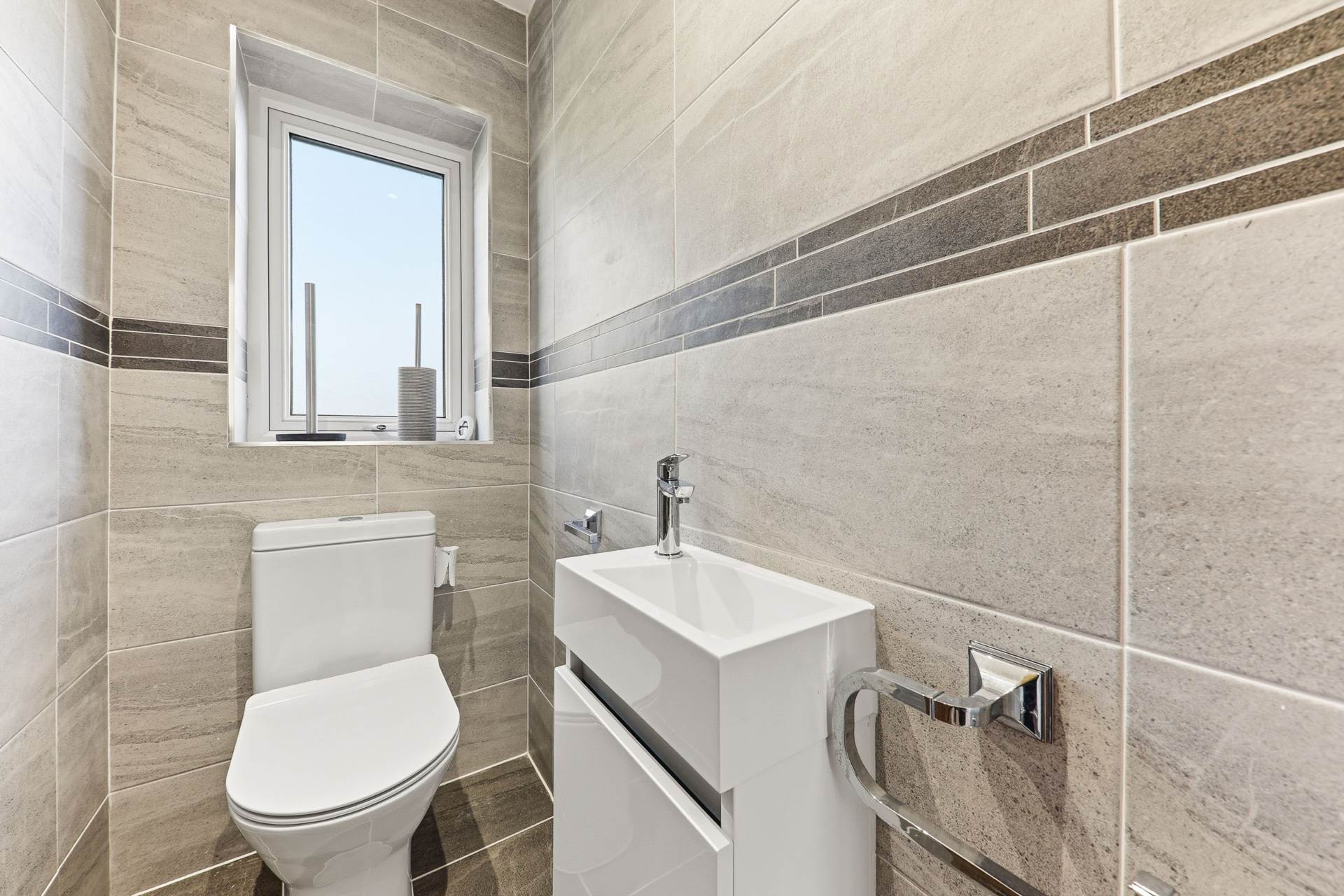To the first floor are three well-proportioned bedrooms, two of which benefit from fitted wardrobes, offering excellent built-in storage. The family bathroom is finished to a high standard and includes a separate bath, seperate shower, and wash basin. The WC is located in a separate room, and both spaces are fully tiled, giving a clean, modern look while adding everyday practicality.