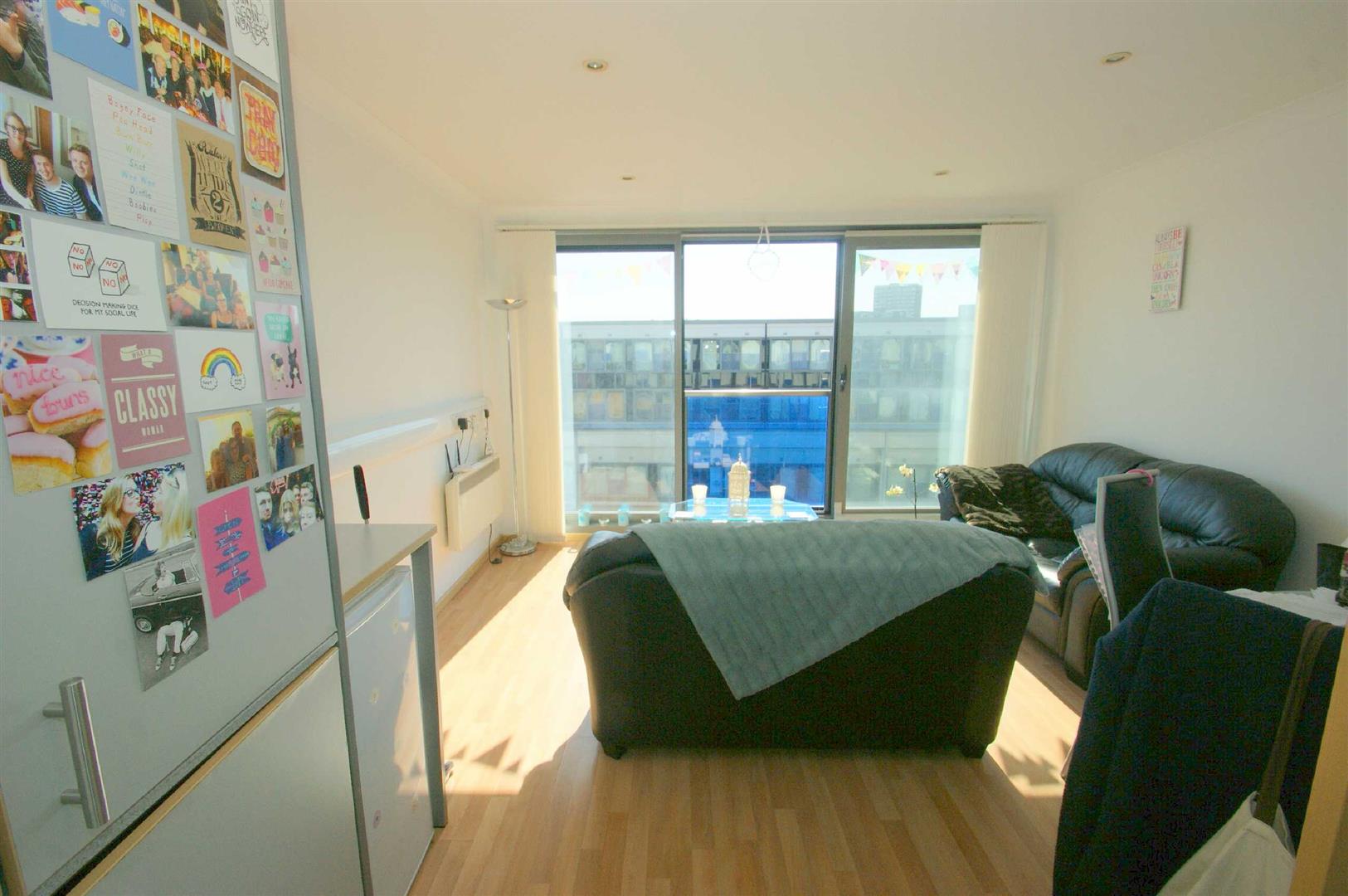 Living Area/Kitchen/Diner - Wood strip laminate flooring, wall mounted electric heater, double glazed floor to ceiling windows with sliding door and Juliette balcony. Kitchenette comprising stainless steel sink, two ring electric hob, oven and space for fridge.