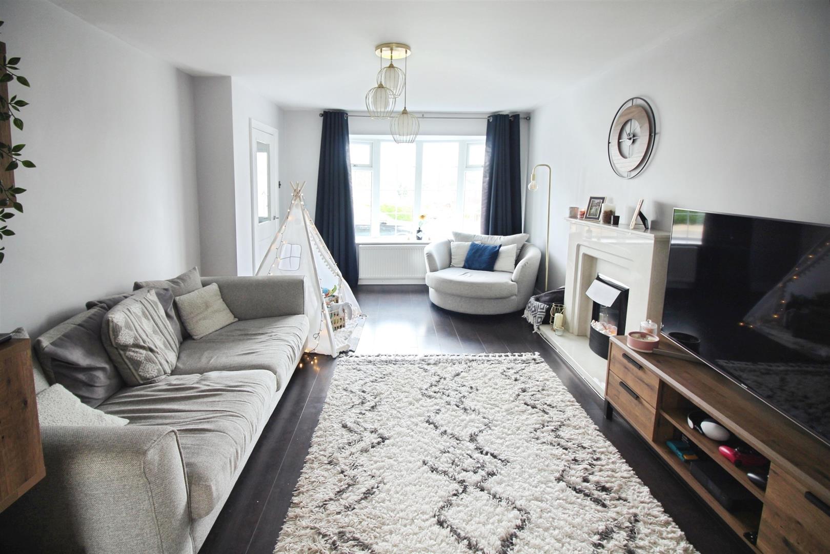 Lounge - 4.86m x 3.55m (15'11" x 11'8") - The lounge is a large light, bright room located to the front of the property with electric fireplace, television point and central heated radiator. PVCu double-glazed bay window affording an abundance of natural light into the property and double doors affording access into;