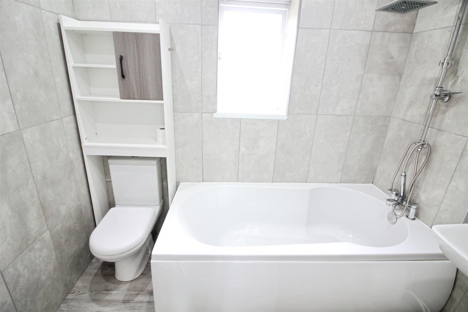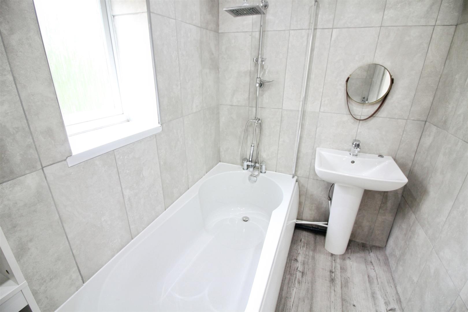 Bathroom - Three piece suite comprising panelled bath with shower over, wash hand basin set in vanity unit, low flush WC, PVCu double-glazed window to the rear and heated towel rail.