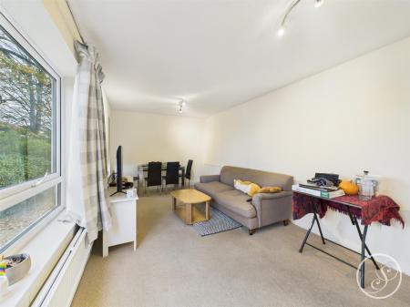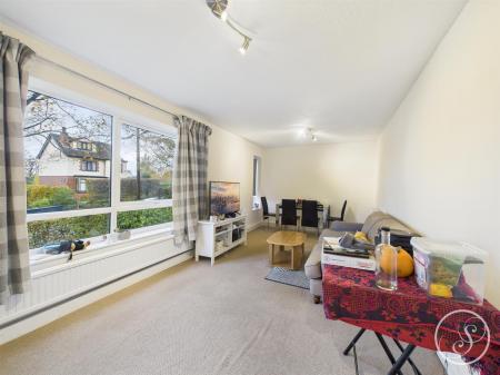 Living Room - A spacious formal living space is laid to carpet and is flooded with natural light from dual aspect windows overlooking the communal grounds. The room offers space for a seating area as well as a dedicated dining space. The lounge/diner leads to the kitchen and out to the balcony.