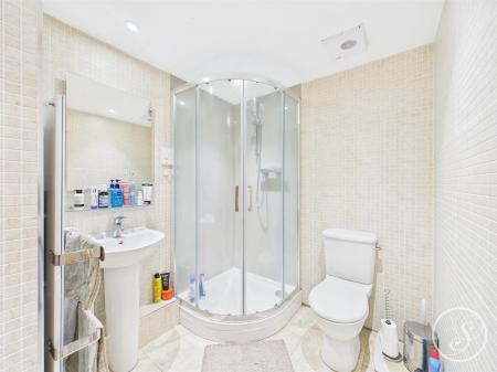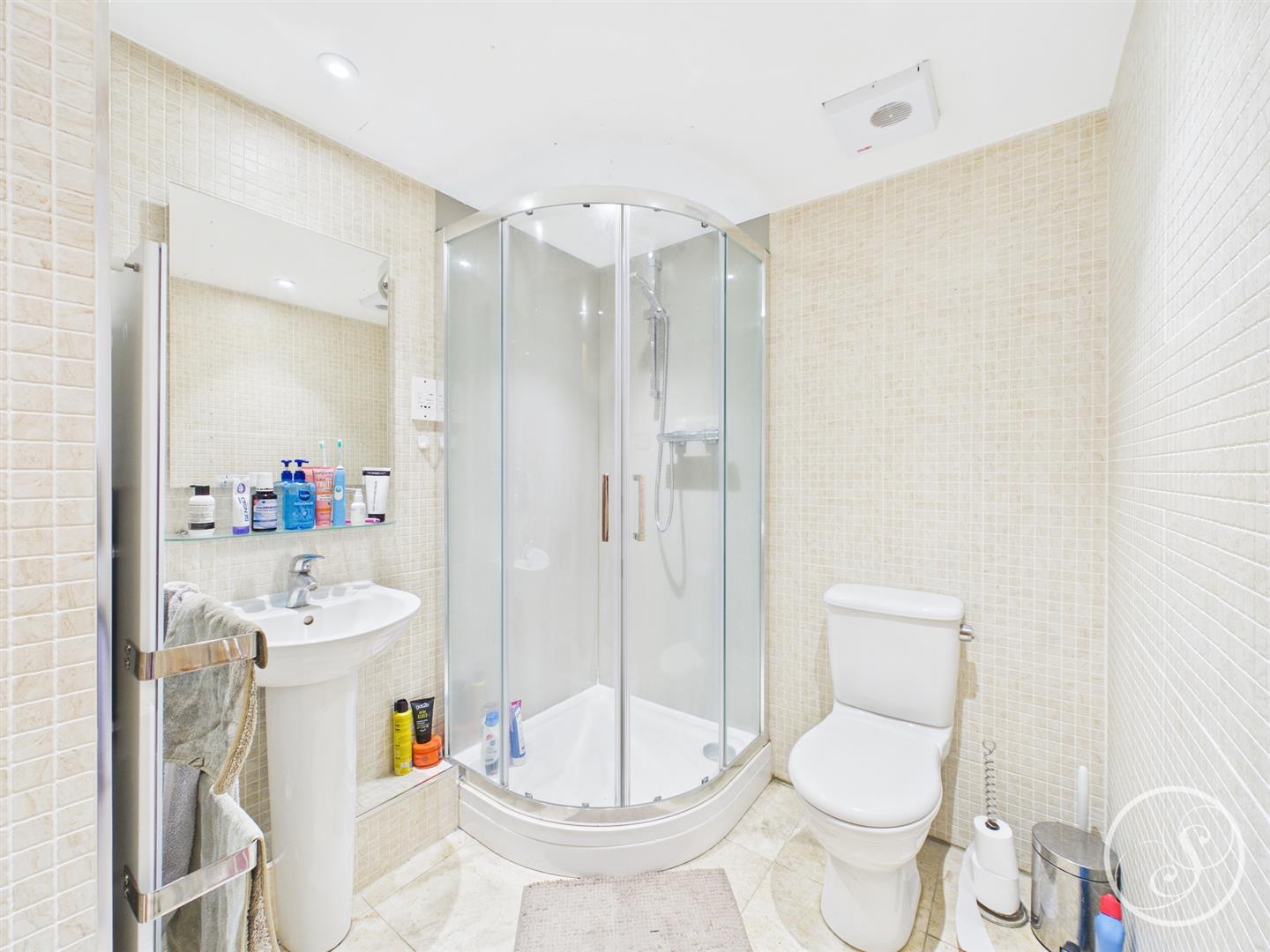 En-Suite - Comprising shower, toilet and sink with storage cupboard.