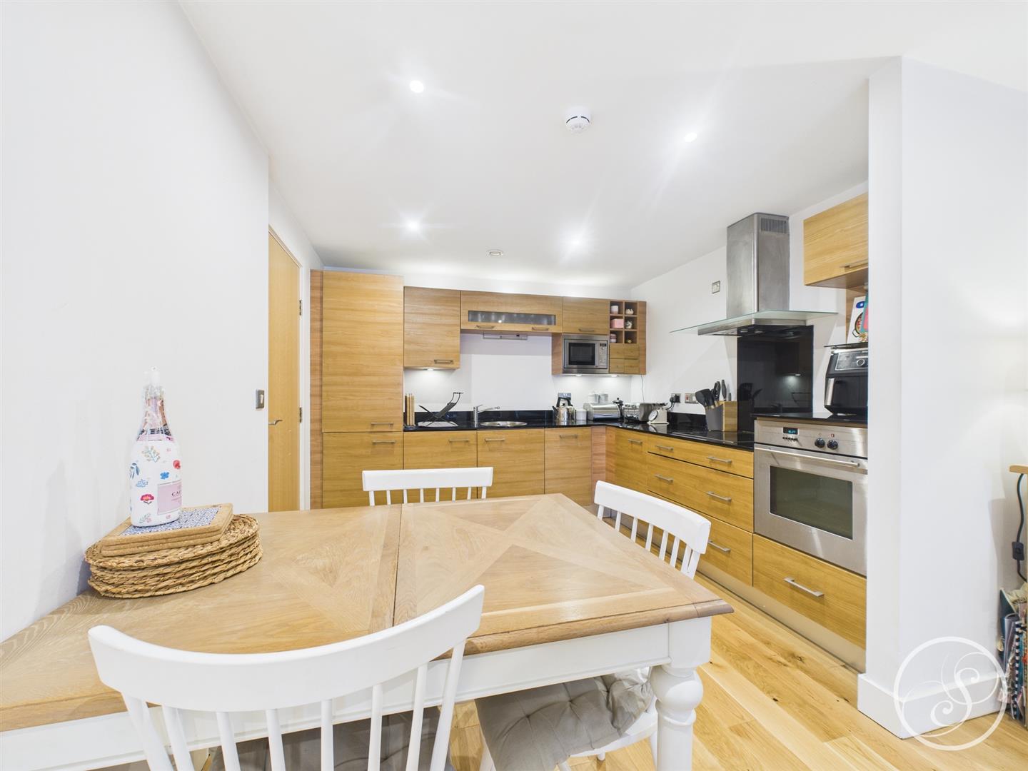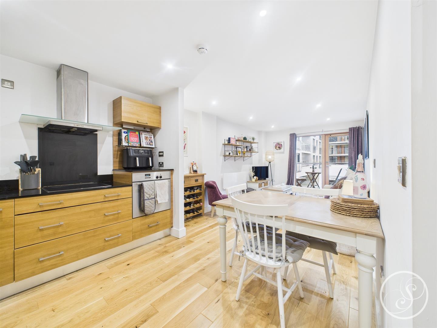 Kitchen/Living Room - Wonderfully presented living space with a dedicated sitting area, space for a dining table and a fitted kitchen complete with integrated oven, electric hob with extractor above, microwave, dishwasher, washing machine, and fridge/freezer. Access offered out to the balcony.