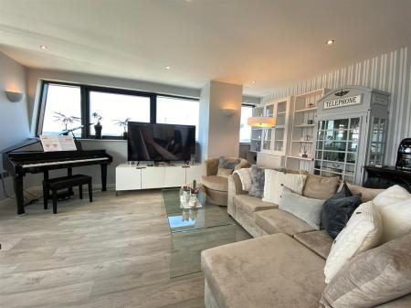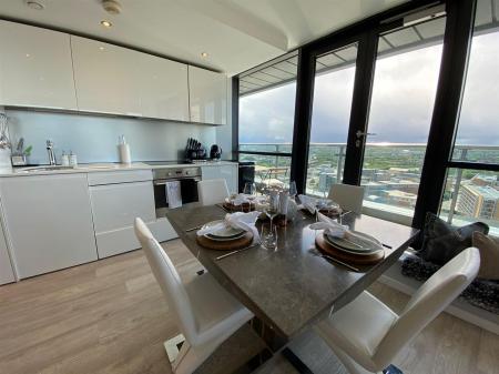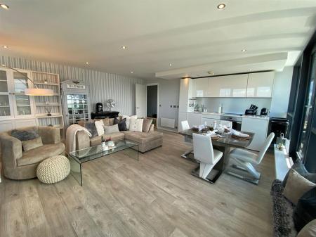 Kitchen/Living/Diner - Accessed from the hallway, this exceptional open-plan living space must be viewed in person to fully appreciate its scale and atmosphere. The bright and airy room is framed by floor-to-ceiling, wall-to-wall windows, flooding the space with natural light and providing uninterrupted panoramic views across the city centre and beyond.